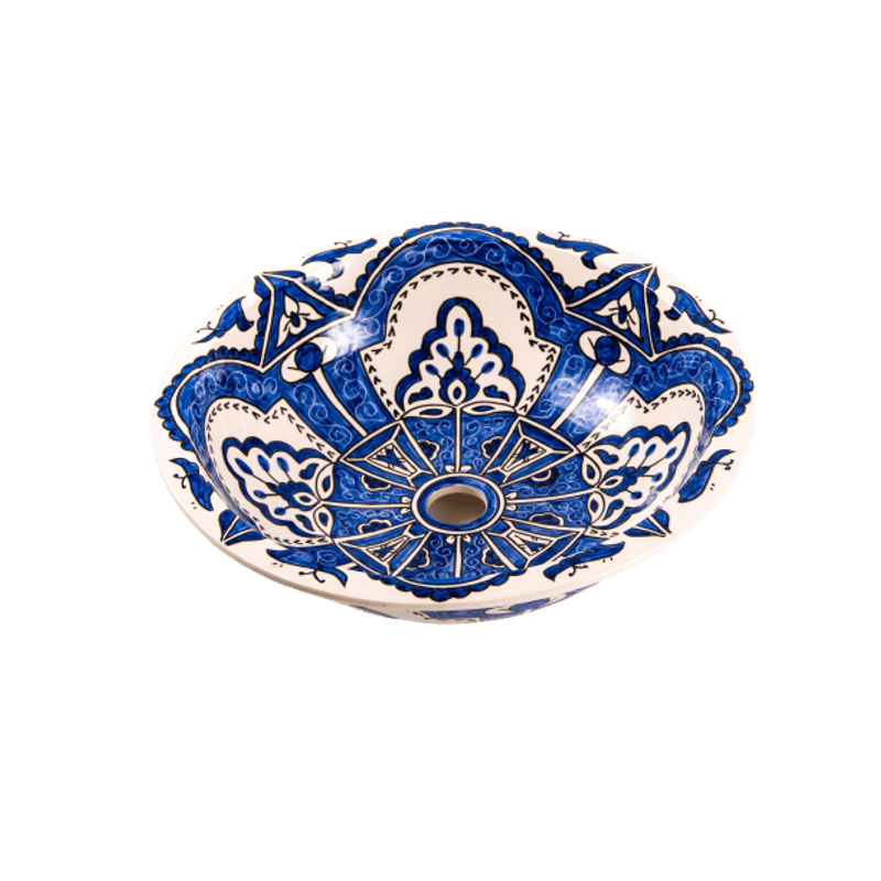 Lavoar rotund Maya, albastru cu alb, din ceramica pictat manual, montaj pe blat sau incastrat 43 x 43 x 14 cm Lavoar rotund Maya, albastru cu alb, din ceramica pictat manual, montaj pe blat sau incastrat 43 x 43 x 14 cm