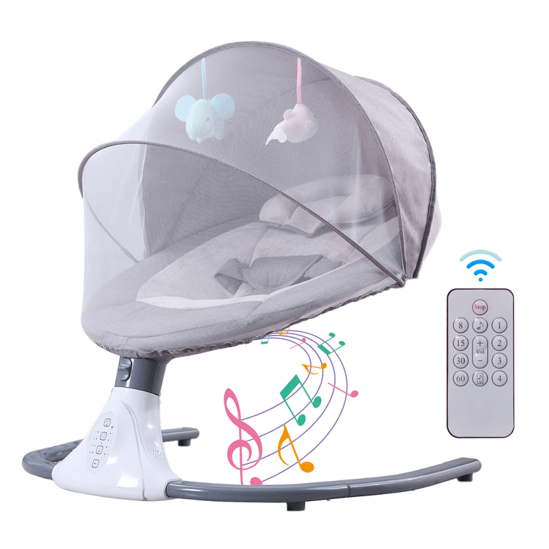 Leagan Electric Multifunctional Pentru Bebelusi, VisionHub®, Conexiune Bluetooth, Telecomanda, Reglabil cu 4 viteze, Jucarii si Melodii, Balansoar Copii cu Acoperis Rabatabil si Plasa Protectie Tantari, Gri.