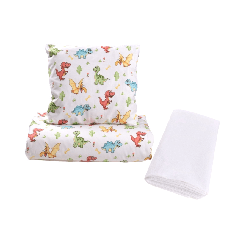 Lenjerie 3 piese model Dinozauri + Protectie impermeabila patut 120x60 cm Lenjerie 3 piese model Dinozauri + Protectie impermeabila patut 120x60 cm