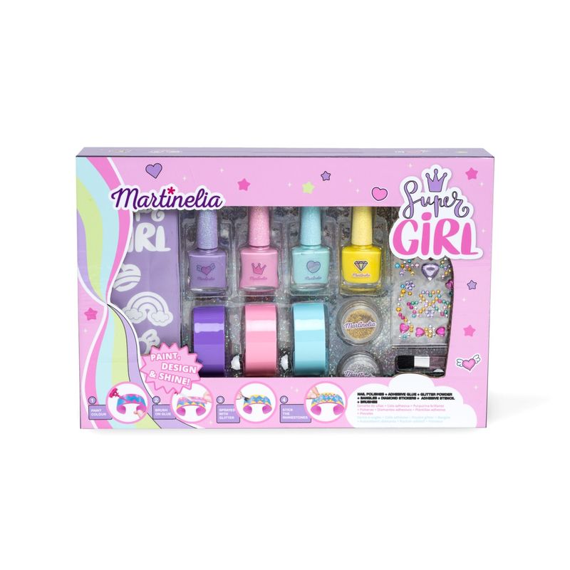 Un superpachet pentru ca cei mici sa-si dezvolte creativitatea, creand si decorand bratari frumoase si completand look-ul cu o manichiura perfecta! Pachetul contine 4 lacuri de unghii 8ml, 1 pila de unghii, 2 doze de sclipici 2gr, autocolante, perie, 3 bratari fixe. Ingrediente Oja Pe Baza De Apa Apa, Stiren/Copolimeri Acrilati, Acid Poliacrilic, Propilenglicol, Silica, Fenoxietanol, Parfum, Limonen, Linalol, Citronelol, Colorant Ci 77891, Ci 158501, Ci 77007, Ci 158502, Ci 15880, Ci 470051. Martinelia este un brand care face parte din grupul Aquarius Cosmetic SL, principalul distribuitor de parfumuri si cosmetice in Spania inca din anul 1995. In ziua de astazi, brandul se gaseste in toata lumea, nu doar in Spania. Produsele brandului la Martinelia pot fi recunoscute cu usurinta datorita ambalajului unic si jucaus. In oferta brandului Martinelia veti gasi seturi de cadouri, accesorii pentru par, popularele balsamuri de buze aromate si alte accesorii care vin in ambalaje haioase. Copiii vor fi incantati de produse precum setul decorativ in forma de ursulet, peria de par unicorn sau periuta de dinti cu sirene. Martinelia ofera pentru cei mici o gama larga de produse distractive si inovatoare in toate culorile curcubeului. Seturi de machiaj, rujuri si tot felul de produse si accesorii concepute pentru a tine pasul cu ultimele tendinte. Produsele sunt sigure si prietenoase cu mediul fiind special proiectate pentru a putea fi folosite de copii.