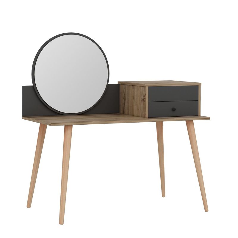 Cu culoarea sa solidă și conceptul modern de noutate, această masă de machiaj adaugă o notă de rafinament oricărui spațiu. Combinația dintre culorile antracit și nuc creează un contrast vizual uimitor, făcându-l un punct de atracție în camera ta.