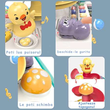 • Tobogan detasabil cu 3 bile incluse si o Ratusca in varf Hipopotam haios: gura hipopotamului se deschide atunci cand apasati pe partea din spate