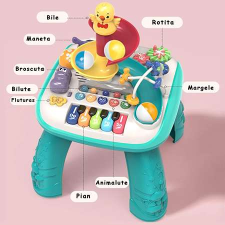 MASA MULTIFUNCTIONALA DE ACTIVITATI BEBE: Aceasta masa de activitati pentru bebelusi este conceputa pentru a stimula si a distra micutul tau. Dispune de un tobogan distractiv, pian pentru copii cu 5 clape, animale simulate, chei de viteza, hipopotam cu gura deschisa, barca cu vasle si margele rulante.. Luminile si sunetele adauga distractie si interactivitate timpului de joaca al bebelusului. Ajuta la dezvoltarea abilitatilor motorii si a creativitatii.