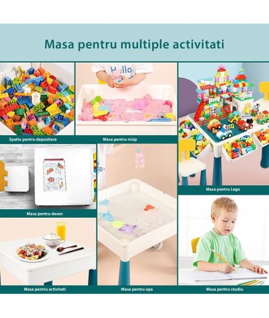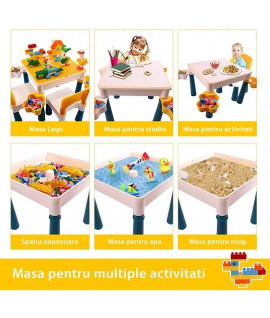 Masa Lego Multifunctionala 7 in 1 Cu Doua Scaune Incluse WePro Store, Nisip, Apa, Studiu, Jucarii, Activitati, 3 Ani+ Masa Lego Multifunctionala 7 in 1 Cu Doua Scaune Incluse WePro Store, Nisip, Apa, Studiu, Jucarii, Activitati, 3 Ani+