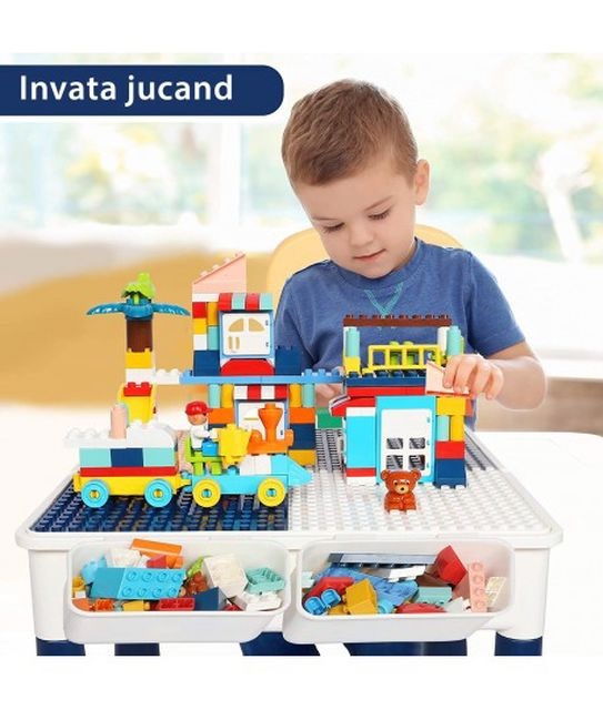 Aceasta masa de activitati multifunctionala este perfecta pentru micutii constructori si exploratori. Setul include DOUA scaunele confortabile si cuburi de construit colorate, stimuland creativitatea si dezvoltarea abilitatilor motorii fine.