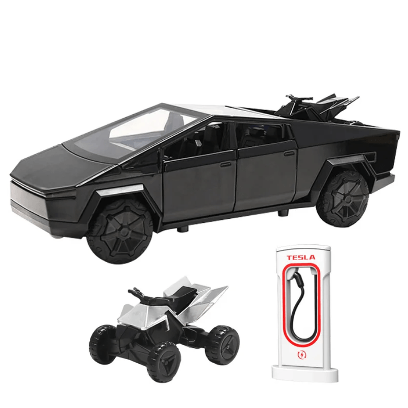 Masina metalica tip Tesla Cybertruck cu ATV si statie electrica de incarcat, sunete realistice, Farurile si stopurile lumineaza, Usile, capota si portbagajul se deschid, 18,5 x7x6cm . Aceasta masina de jucarie minunata este o replica a revolutionarului Cybertruck de la Tesla, iar copilului tau ii va placea sa o conduca.