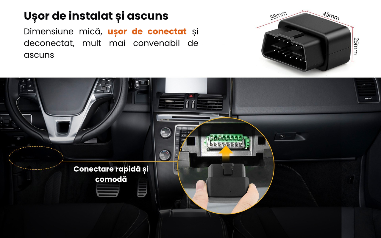 Tracker GPS OBD compatibil cu 99% dintre autoturisme, alimentare directa 9–40V. Conectare instant in mufa OBD – fara fire, fara batai de cap! Compact, discret si usor de ascuns, ideal pentru monitorizare auto inteligenta.