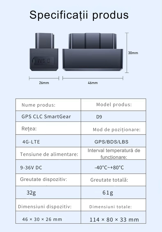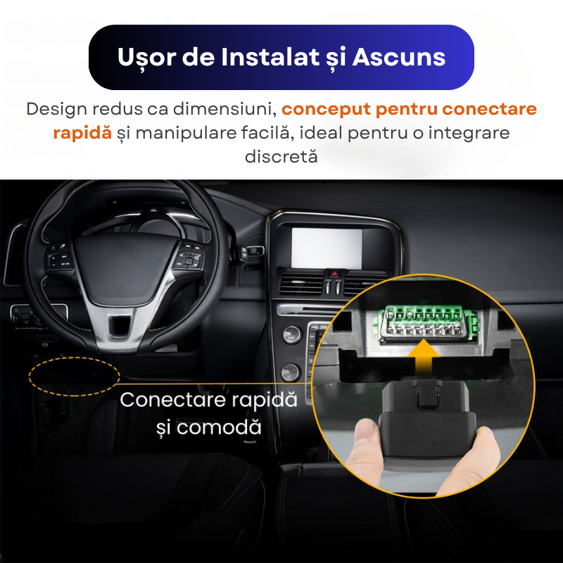Dispozitivul prezentat este caracterizat printr-un design compact, special conceput pentru conectare rapida si manipulare usoara. Dimensiunile reduse permit o integrare discreta in interiorul vehiculului, asigurand in acelasi timp un proces simplificat de instalare.