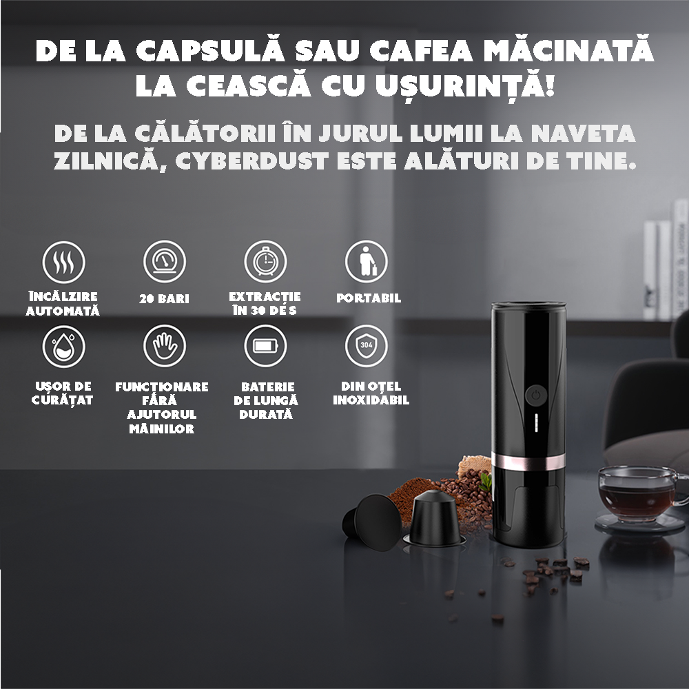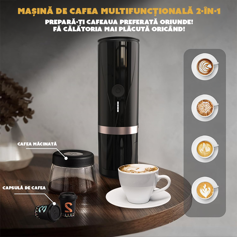 Compatibilitate Universala: Acest espressor portabil este compatibil atat cu cafea macinata, cat si cu capsule de cafea, oferindu-va flexibilitate maxima in prepararea bauturii preferate.