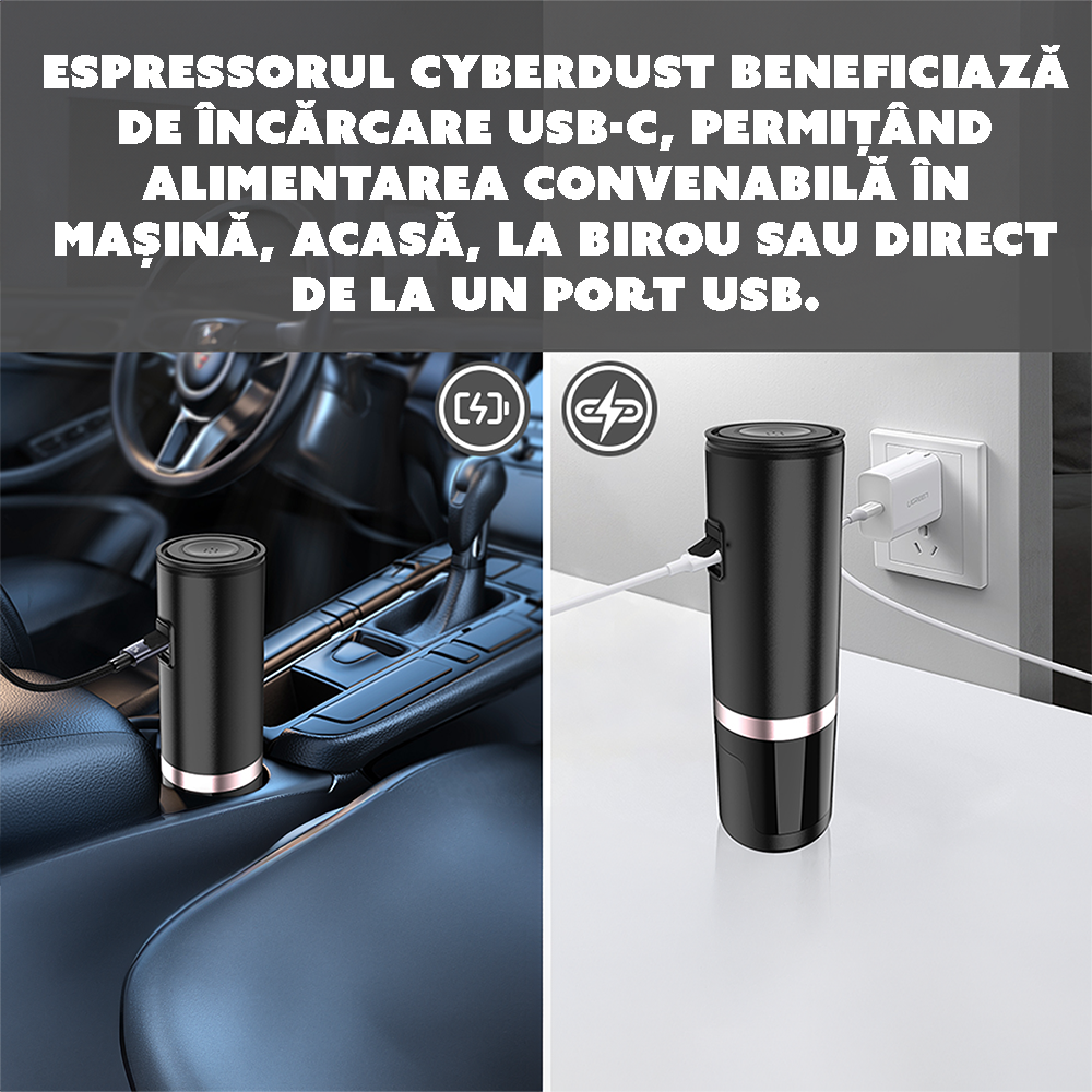 Incarcare Convenabila USB-C: Dotat cu o baterie puternica de 7800mAh, espressorul se incarca rapid prin USB-C, asigurand multiple sesiuni de cafea oriunde v-ati afla.