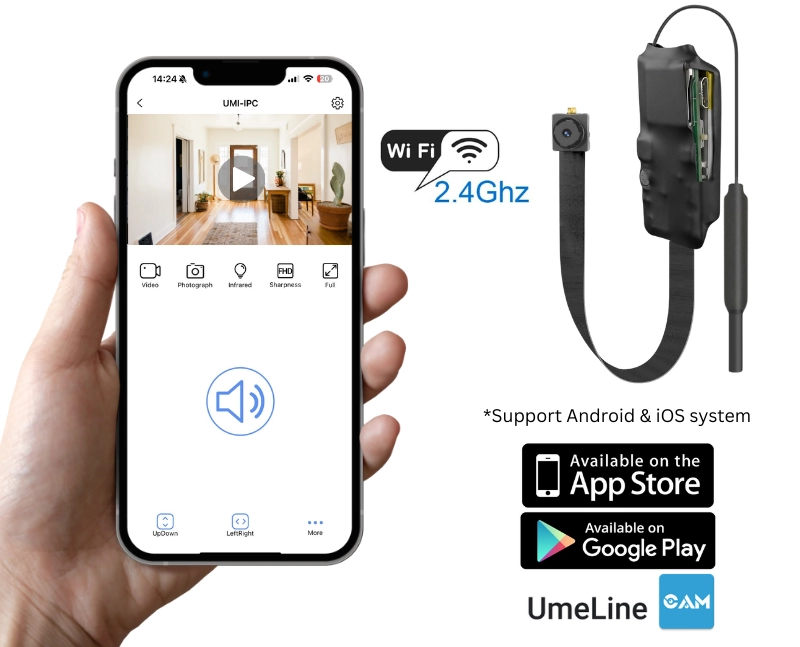 Pentru a utiliza conexiunea Wi-Fi, trebuie sa descarcati aplicatia UmeLine pe smartphone, care este disponibila in Google Play sau App Store si configurati camera spion cu router Wi-Fi (numai 2.4 GHz).
