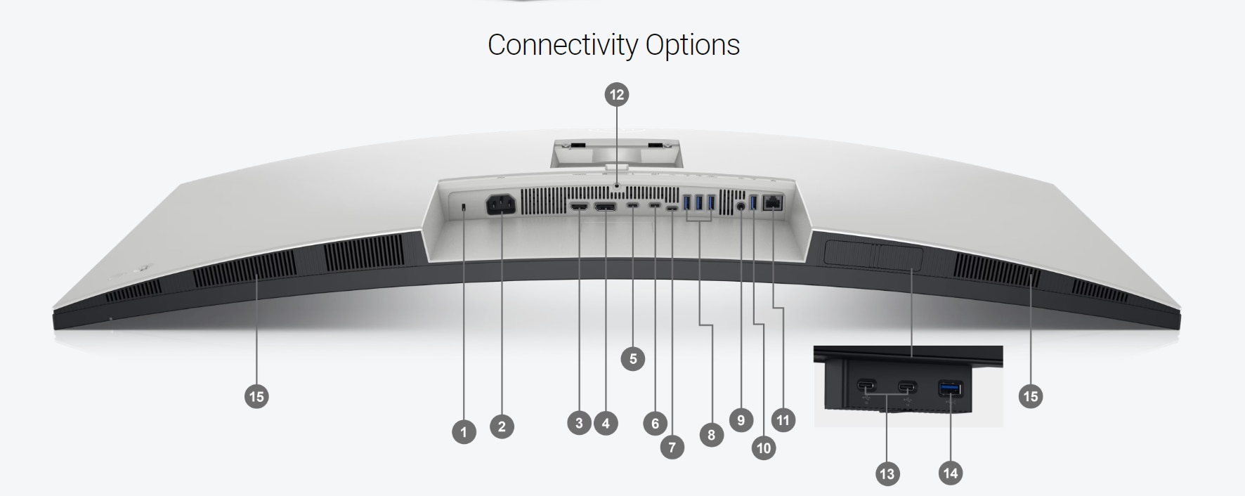 11. RJ45 port 12. Stand lock 13. 2 x USB Type-C downstream port (SuperSpeed USB 10 Gbps, USB 3.2 Gen2) with power charging (15W) 14. USB Type-A downstream port (SuperSpeed USB 10 Gbps, USB 3.2 Gen 2) with BC1.2 power charging 15. Speakers