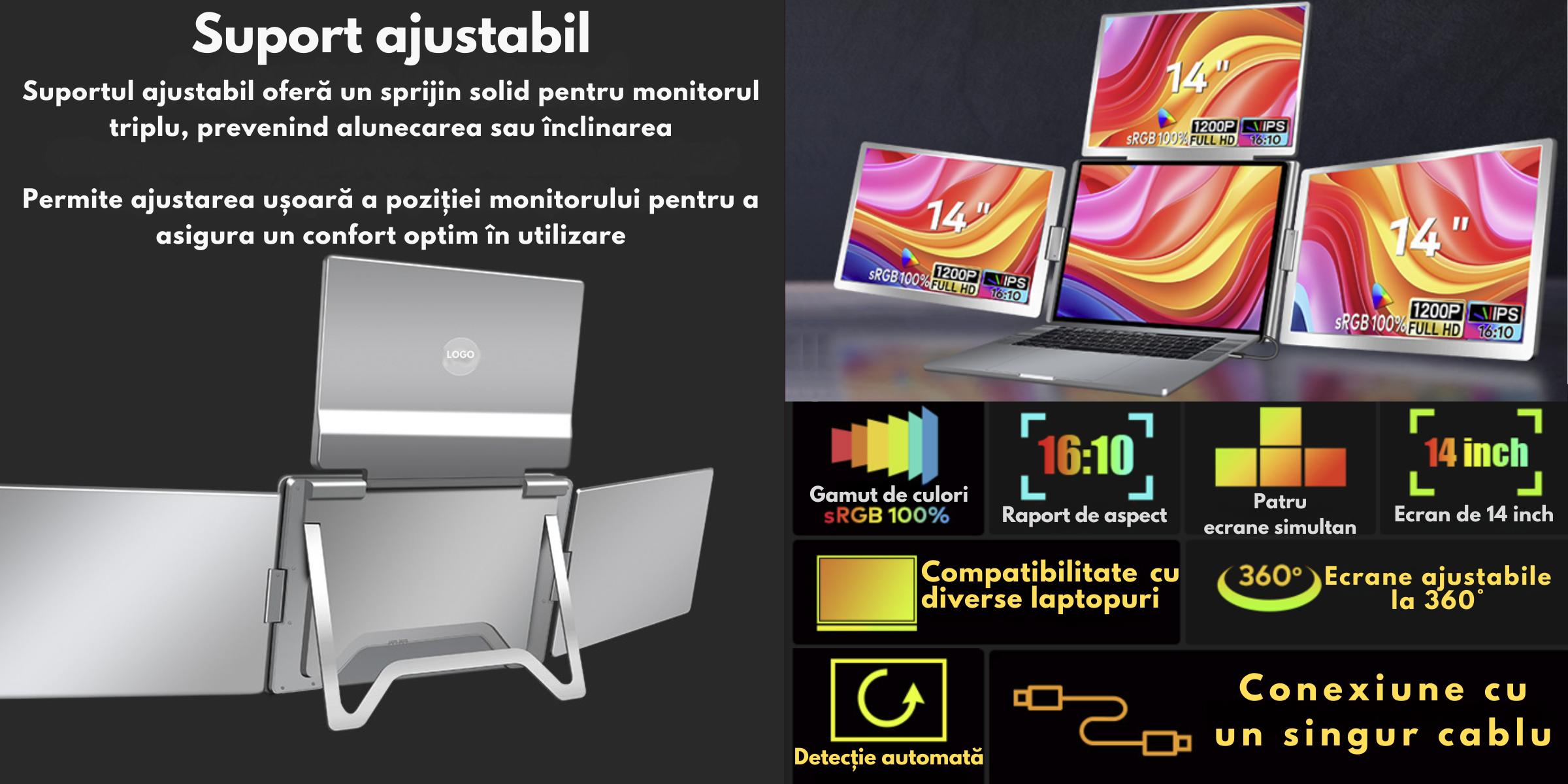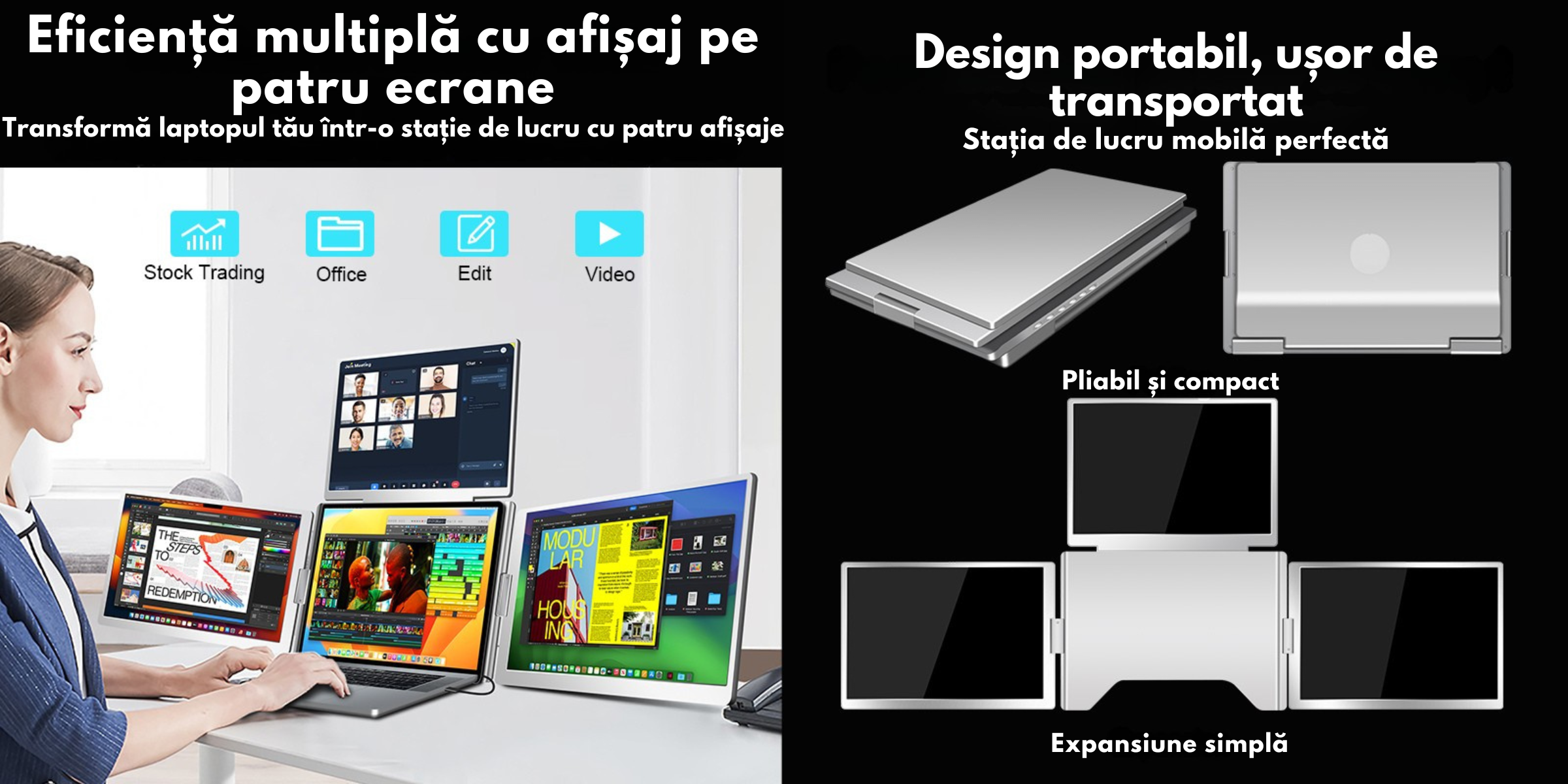 Transforma-ti laptopul intr-o statie de lucru completa cu monitorul triplu portabil proiectat pentru profesionisti, creativi si utilizatori care prioritizeaza productivitatea. Acest dispozitiv inovator iti ofera posibilitatea de a extinde ecranul laptopului tau cu pana la trei afisaje suplimentare, ideale pentru multitasking, editare video, trading pe bursa sau intalniri virtuale.