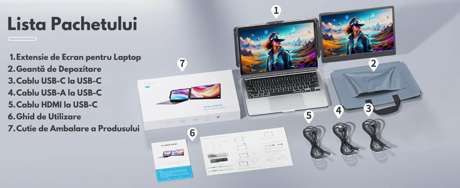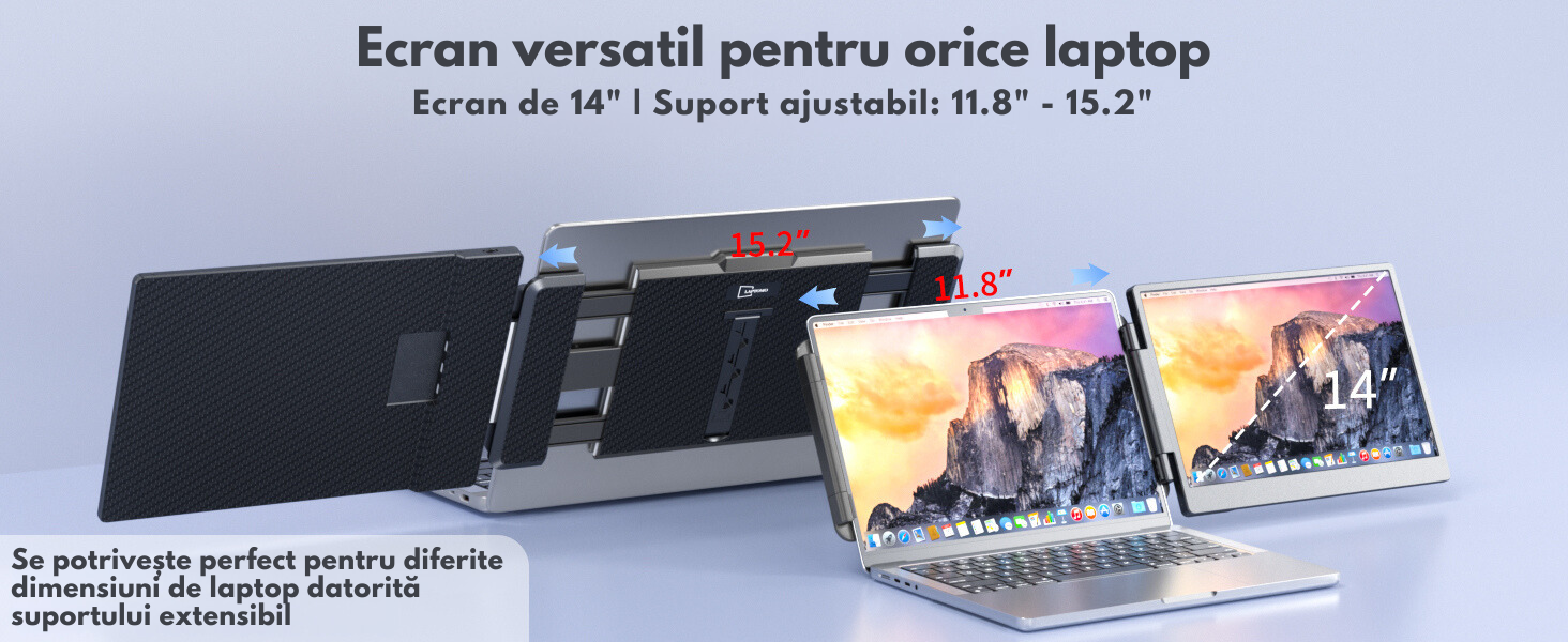 Transforma modul in care lucrezi, inveti sau te relaxezi cu extensorul de ecran dual de 14 inch, o solutie inovatoare pentru utilizatorii moderni de laptopuri. Cu un design inteligent, versatilitate exceptionala si compatibilitate extinsa, acest dispozitiv redefineste multitasking-ul, oferindu-ti performanta maxima intr-un format compact si usor de transportat.
