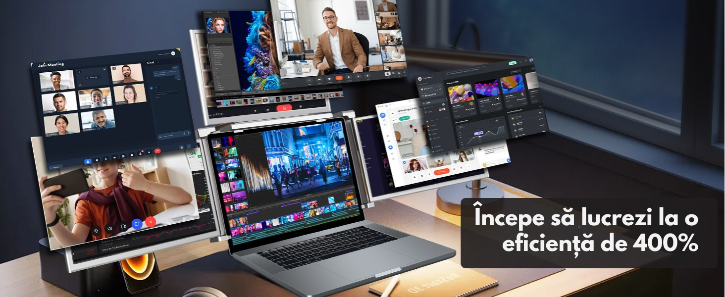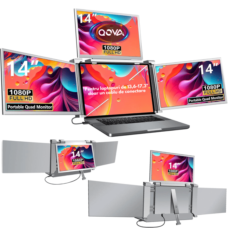 Transforma-ti laptopul intr-o statie de lucru ultra-productiva cu QOVA 14” Quad Screen Extender – solutia revolutionara de afisaj pentru profesionisti, creatori de continut, gameri, analisti si utilizatori business care au nevoie de eficienta sporita, mobilitate si multitasking avansat.