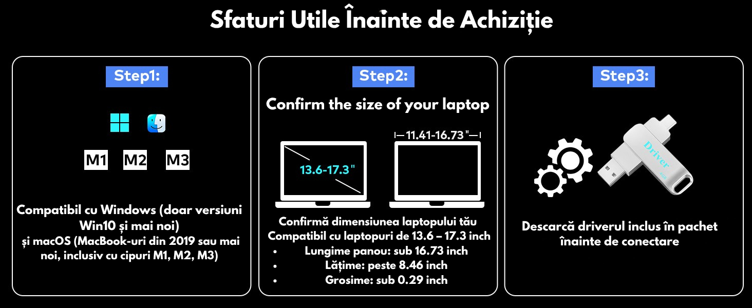 ✅4 ecrane active simultan (inclusiv cel al laptopului) – folosesti 3 monitoare suplimentare de 14" pentru a extinde vizibil spatiul de lucru cu pana la +400% productivitate ✅Panouri IPS FHD 1080p (1920x1080) – ofera claritate superioara, unghiuri largi de vizualizare si culori vibrante pentru editare, design grafic sau conferinte ✅Compatibilitate universala – functioneaza perfect cu Windows 10/11, MacBook 2019+ cu procesoare M1, M2, M3 ✅Conectivitate flexibila – ai la dispozitie: