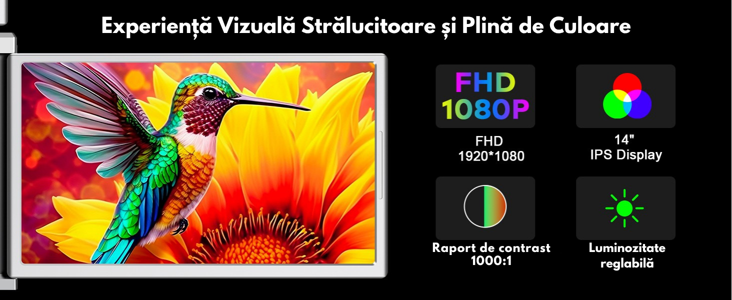 Pentru Mac – driver inclus pe stick USB ✅Transportabil si compact – se pliaza si incape in geanta de transport inclusa, ideal pentru calatorii sau munca de oriunde ✅Luminozitate ajustabila, contrast 1000:1, raport imagine 16:9 – pentru confort vizual pe termen lung ✅Design patentat, usor si elegant – perfect pentru birou, casa, scoala, prezentari sau videoconferinte