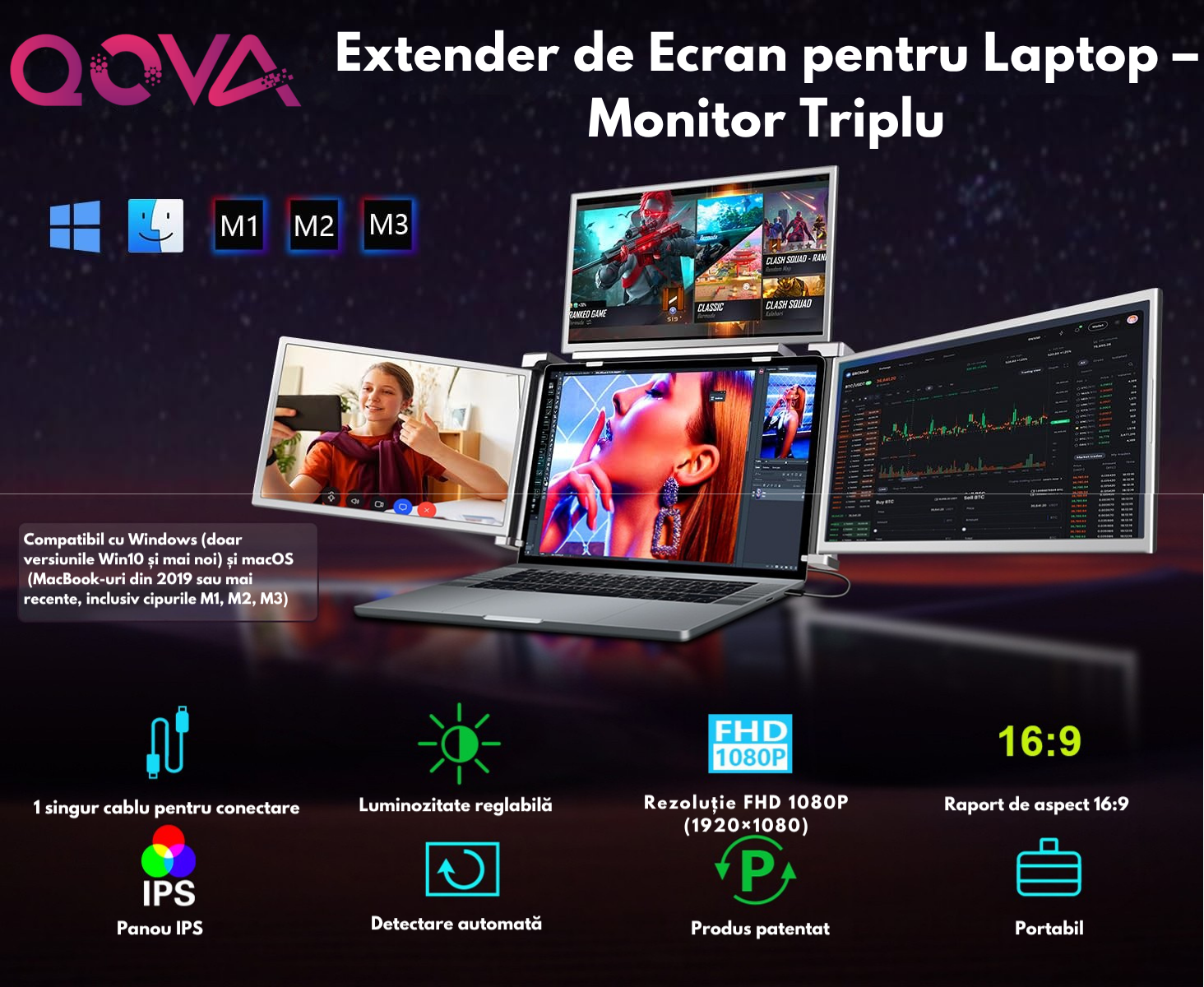 Monitor Extensibil si Portabil pentru laptop, QOVA®, Quad Screen de 14 inch, 3 Ecrane IPS - Full HD 1080p pliabile si rotative 360°, Compatibil Windows & Macbook, Suport reglabil compatibil cu laptopuri de 13 "6" -17.3", Luminozitate Reglabila, Geanta