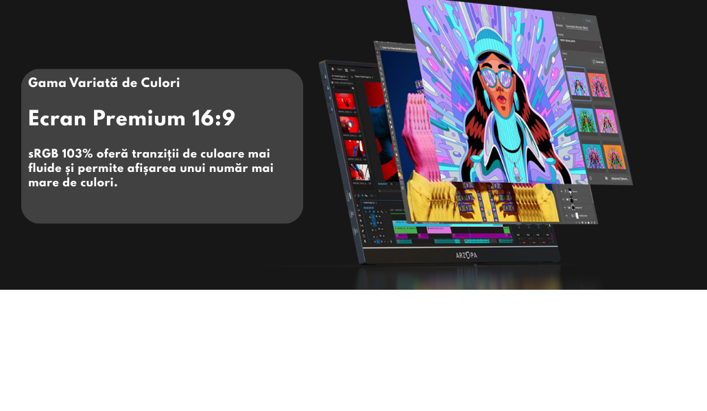 Transforma-ti modul de lucru si divertismentul cu monitorul portabil Arzopa de 17,3 inch, un ecran Full HD versatil si elegant, ideal pentru birou, calatorii, gaming sau editare grafica. Acest monitor portabil cu ecran 1920x1080 si acoperire 100% sRGB ofera culori vibrante si detalii incredibile, fiind perfect pentru creatori de continut, dezvoltatori sau pasionati de multimedia!