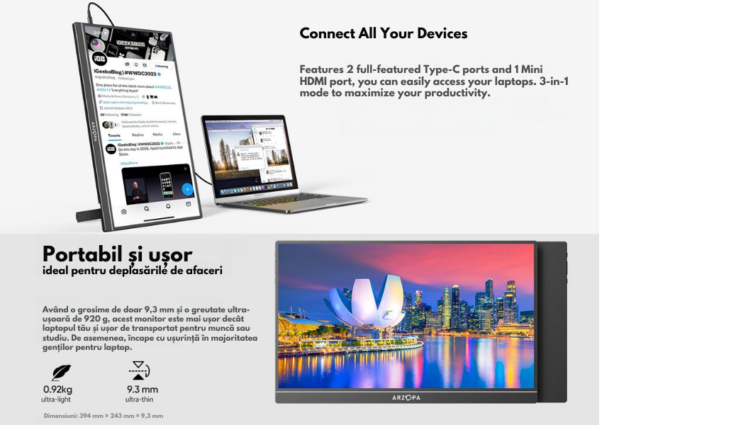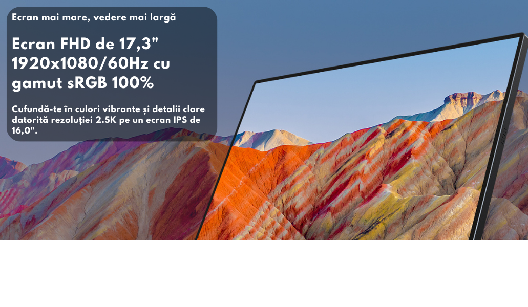 🔹Dimensiune ecran: 17.3 inch | 🔹Rezolutie: 1920 x 1080 Full HD 🔹Panou: a-Si TFT-LCD IPS | 🔹Rata refresh: 60Hz 🔹Conectivitate: 2x USB-C 3.1 + 1x miniHDMI 2.0 🔹Culori vibrante: 100% sRGB | 🔹Carcasa: Aluminiu integral 🔹Greutate: Doar 920g | 🔹Grosime: 9,3 mm