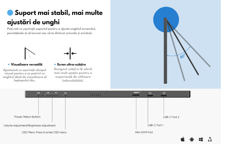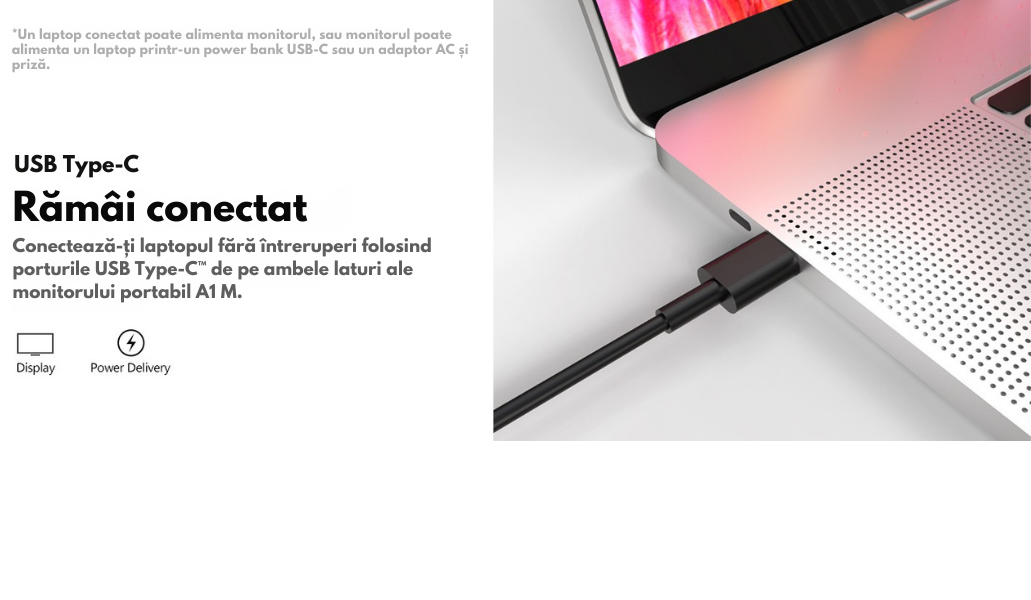 Monitorul este echipat cu 2 porturi USB-C 3.1 full-feature (Display + Power Delivery) si 1 port Mini HDMI, oferind compatibilitate extinsa cu: