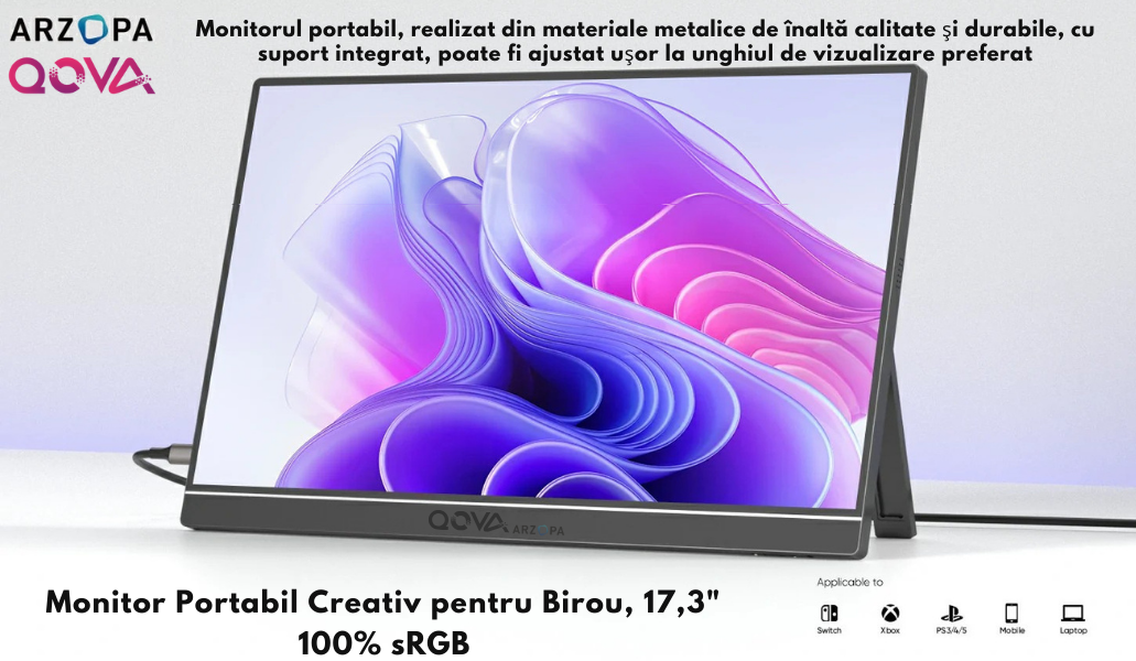 Monitor Portabil Arzopa & Qova® de 17.3" inch - FHD, 100% sRGB, HDR 1920x1080, USB-C & Mini HDMI – Ecran Ultra-Subtire, 60Hz, Compatibil Laptop, Telefon, Consola, Dual Speaker, Gaming, Birou, Calatorii si Creativitate, Carcasa Metalica, Suport Integrat