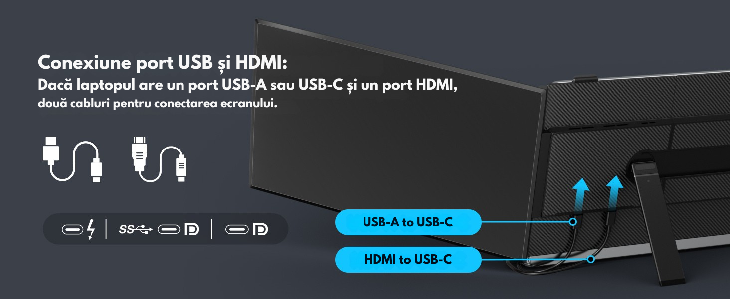 Monitor Portabil dual Extensibil de 14.2 inch, Qova®, Ecran IPS, Full HD 1080p, 300 Nits, 60Hz, Contrast 1.000:1, compatibil laptopuri 13"-17.3", conectivitate USB-C/HDMI, Plug & Play, Compatibil Windows/MacOS/Linux/Android, Suport si Husa Incluse