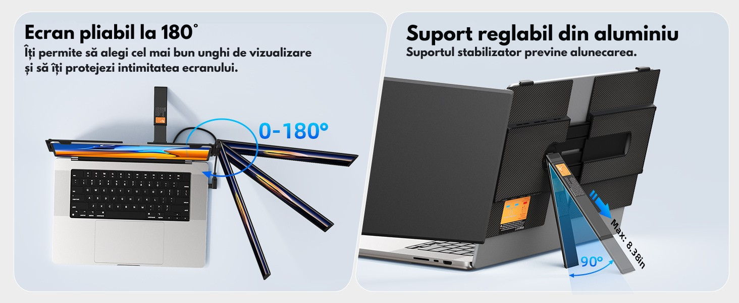 Design extensibil & rotativ 180° – suport pentru moduri Extins, Oglinda, Portret si Mobil.