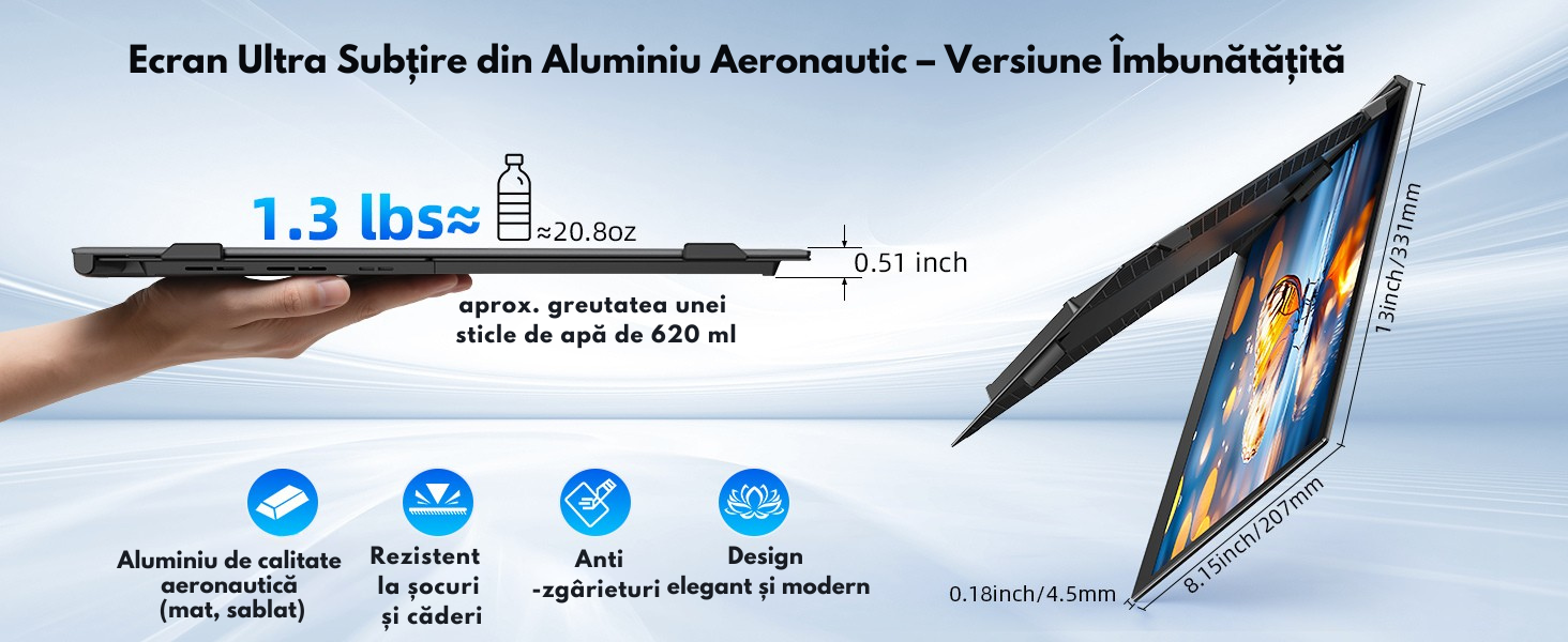 Design ultra-subtire si portabil – doar 875 g cu husa inclusa, perfect pentru deplasari.