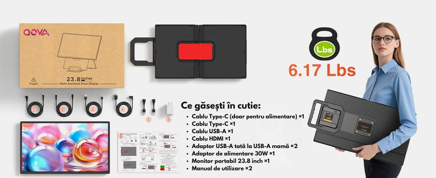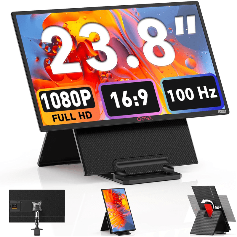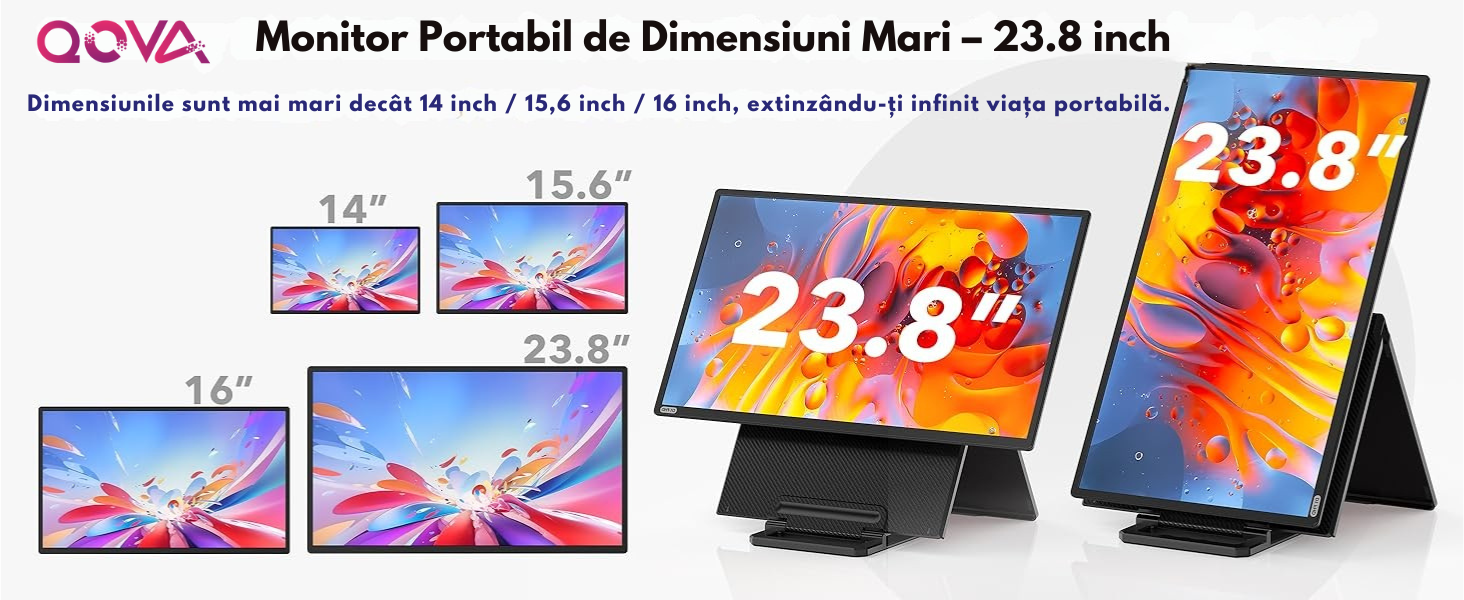 Monitor Portabil si Extensibil de 23.8 inch, Qova®, Ecran IPS, Full HD 1080p, 100Hz, 300 Nits, 120% sRGB, raport 16:9, Difuzor integrat, Conectivitate USB-C/HDMI, Plug & Play, Compatibil PC, laptop, console, rotatie de 90°/inaltime reglabila/pliabil