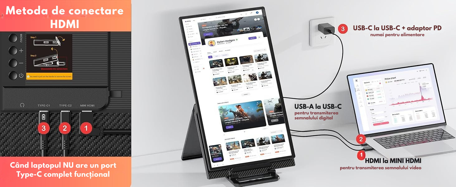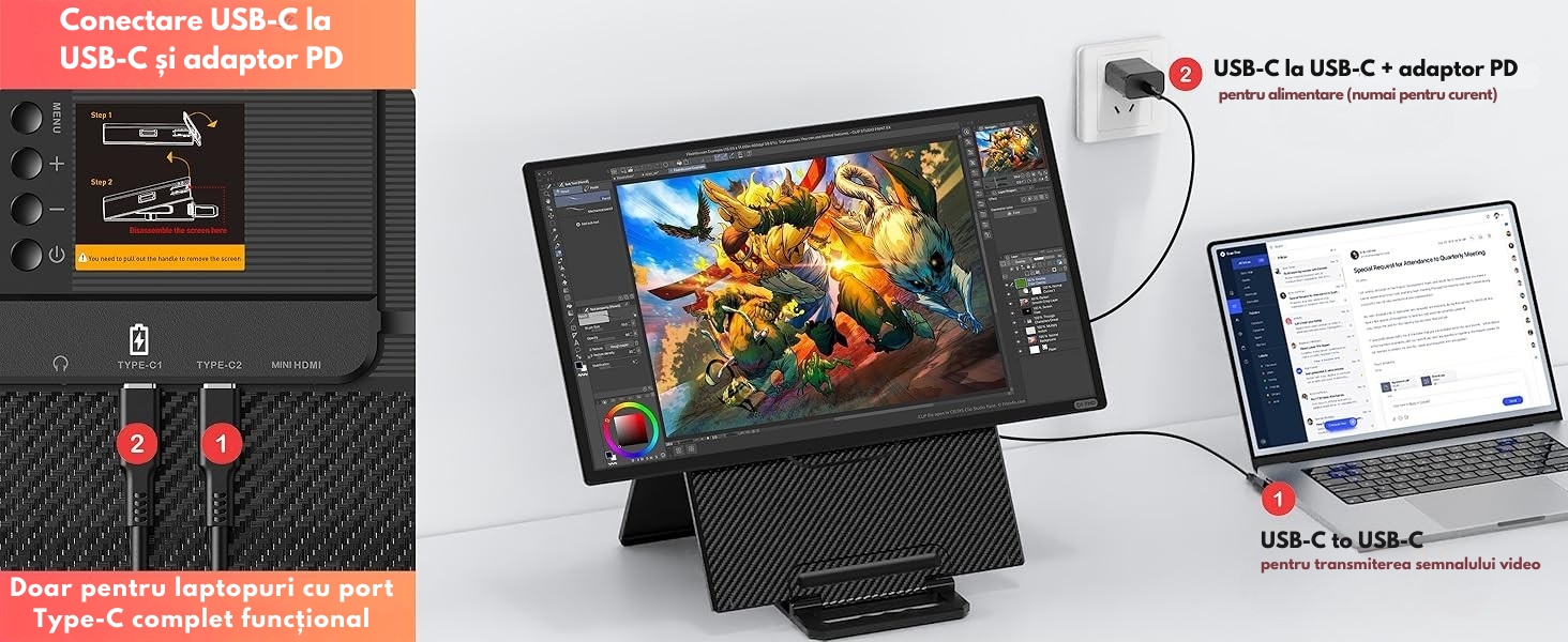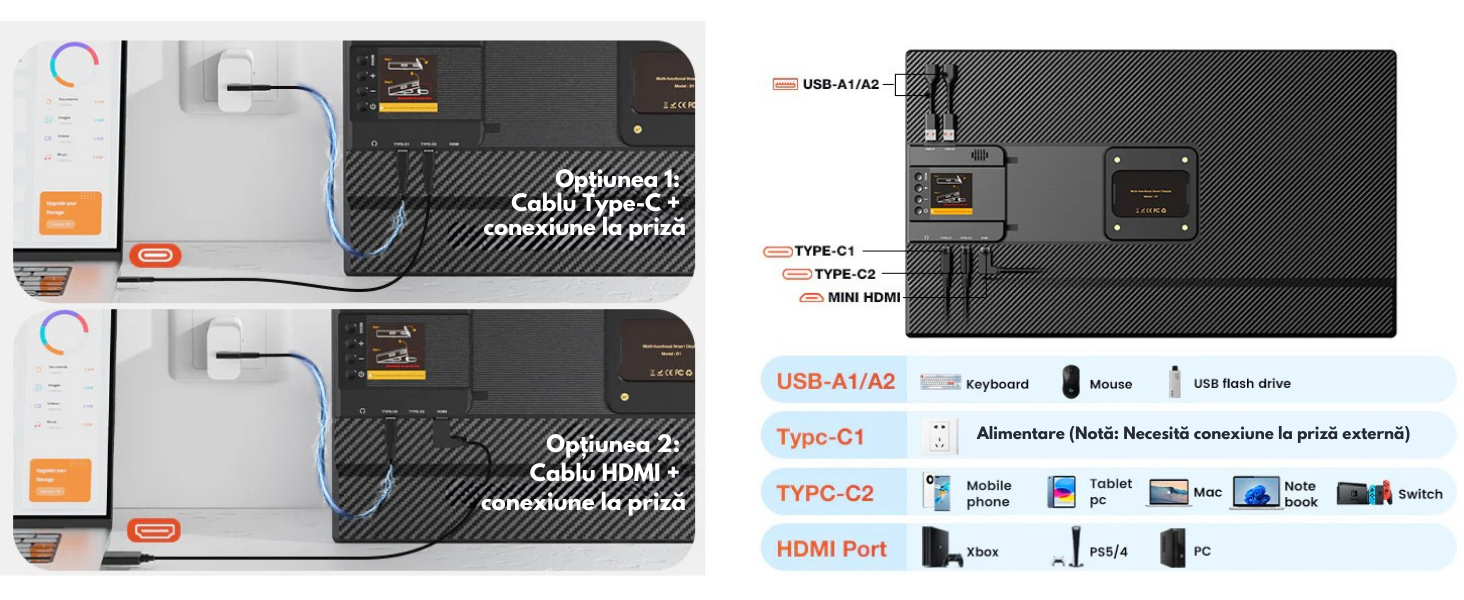 【Plug and Play】 Bucura-te de simplitatea tehnologiei plug and play cu un singur cablu! Produsul vine cu toate cablurile necesare (TYPE-C, USB-C la USB-A si HDMI). Functionarea printr-un singur cablu este posibila printr-o conexiune directa USB-C la USB-C. Daca laptopul tau nu are un port Type-C complet functional, poti folosi combinatia HDMI + USB-C. (Nota: la utilizarea monitorului, este necesara conectarea adaptorului de alimentare original de 30W inclus in pachet.)