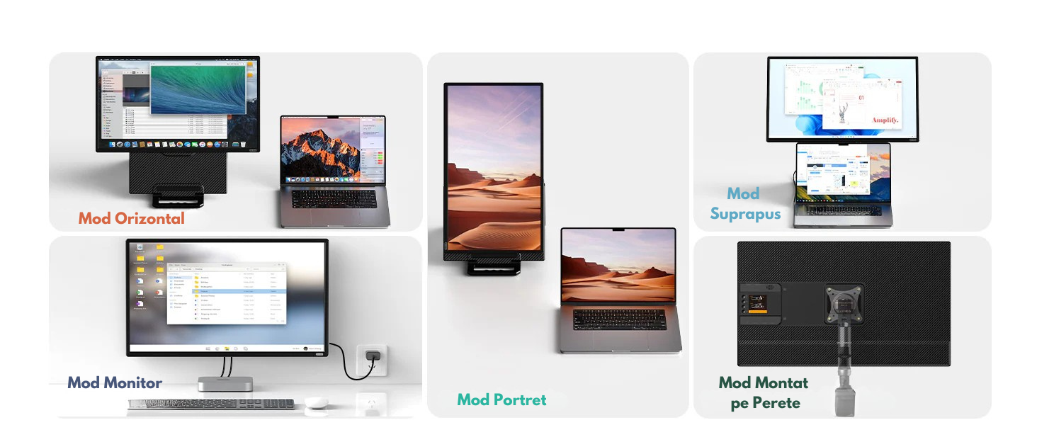 Design magnetic, ajustabil si compatibil VESA – mod orizontal/portret, montare pe perete sau birou.