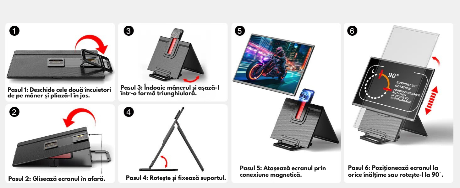 【Suport detasabil si mod VESA】 Monitorul portabil de 23,8 inch suporta montaj VESA. Pe spate sunt prevazute gauri VESA 75 x 75 mm si suruburi M4 x 4. Produsul este echipat cu un suport reglabil integrat (Nota: ecranul poate fi rotit la 90°, dar doar spre stanga si dreapta). Panoul suportului poate fi ajustat orizontal pana la 75°, iar inaltimea poate fi reglata intre 0 si 5 inch. Se transforma cu usurinta intr-un al doilea ecran ergonomic si comod.