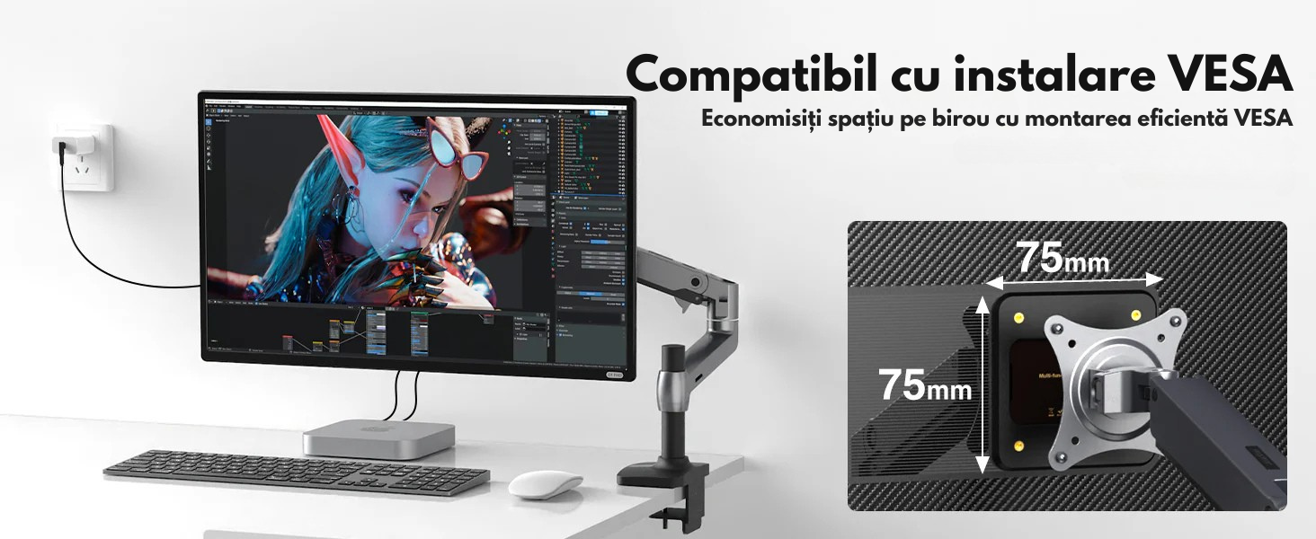 Standard VESA 75x75mm – montare pe perete sau pe brat robotic.