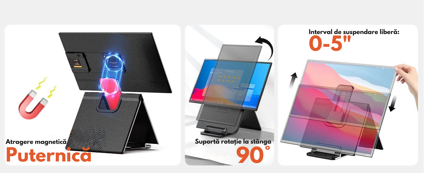 Design magnetic flexibil – reglare libera 0–5” si rotire la 90° (mod orizontal/portret).