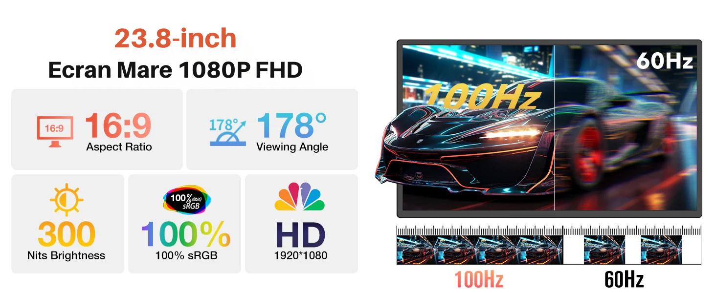 【Experienta vizuala excelenta, culori nelimitate】 Monitorul de 23,8 inch pentru laptop este echipat cu panou IPS, rata de reimprospatare de 100Hz si unghi larg de vizualizare de 178°, acoperire a spectrului de culori de pana la 90% NTSC si luminozitate de 300 cd/m². Formatul de ecran 16:9 ofera o experienta confortabila la vizionarea filmelor. Bucura-te de avantajele unui ecran mare si lucreaza mai eficient. Daca iubesti multitasking-ul sau vrei o experienta mai buna de divertisment, acest monitor este alegerea perfecta!