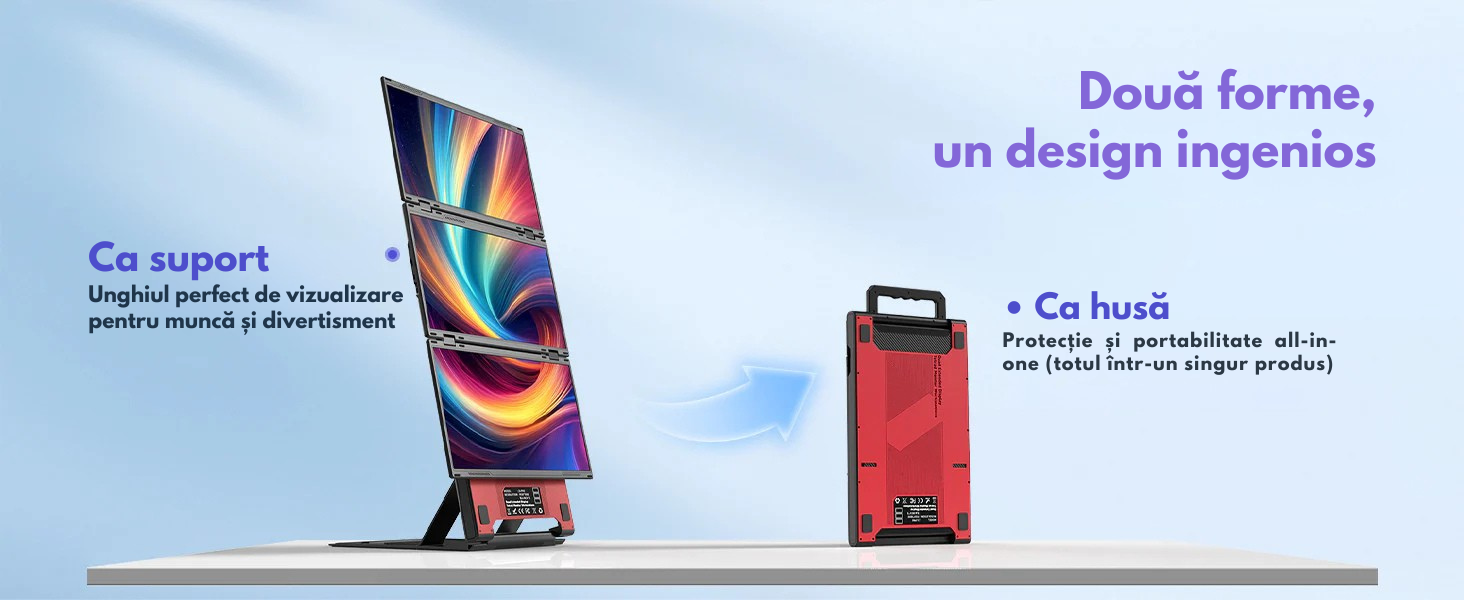 -Design inovator 2-in-1: husa de transport si suport — se pliaza pentru portabilitate si se desface instant pentru utilizare pe birou. Nu necesita asamblare suplimentara.