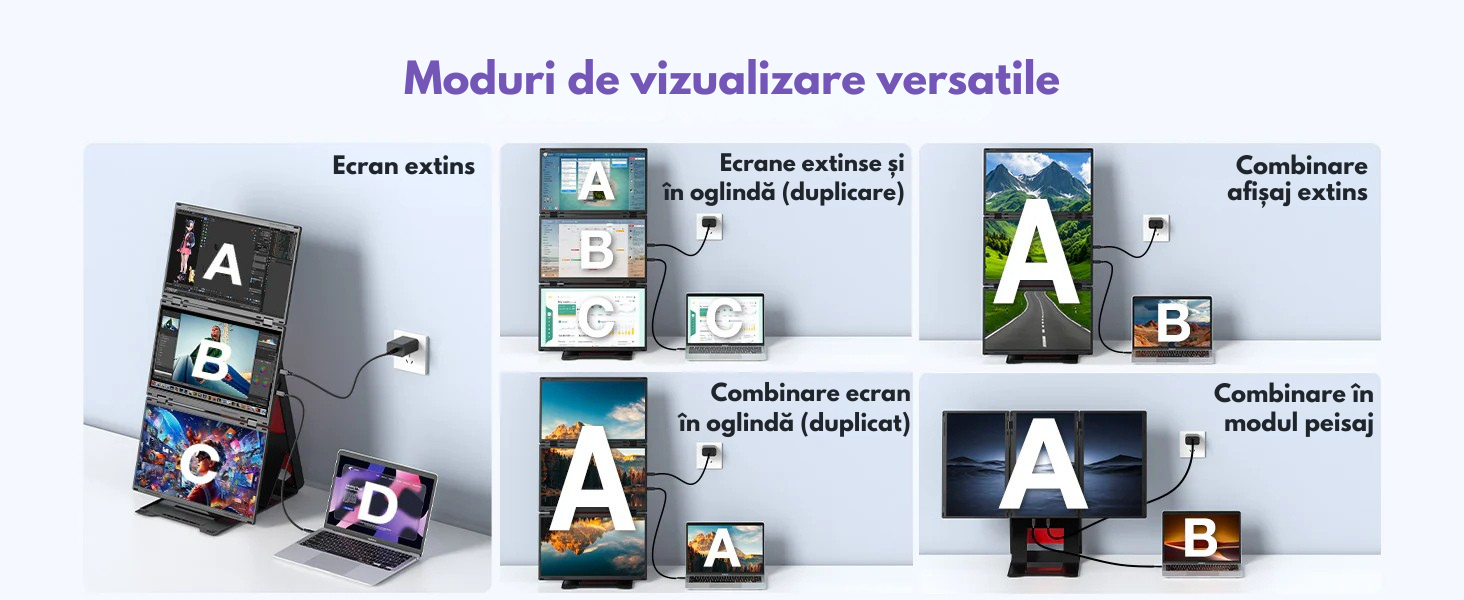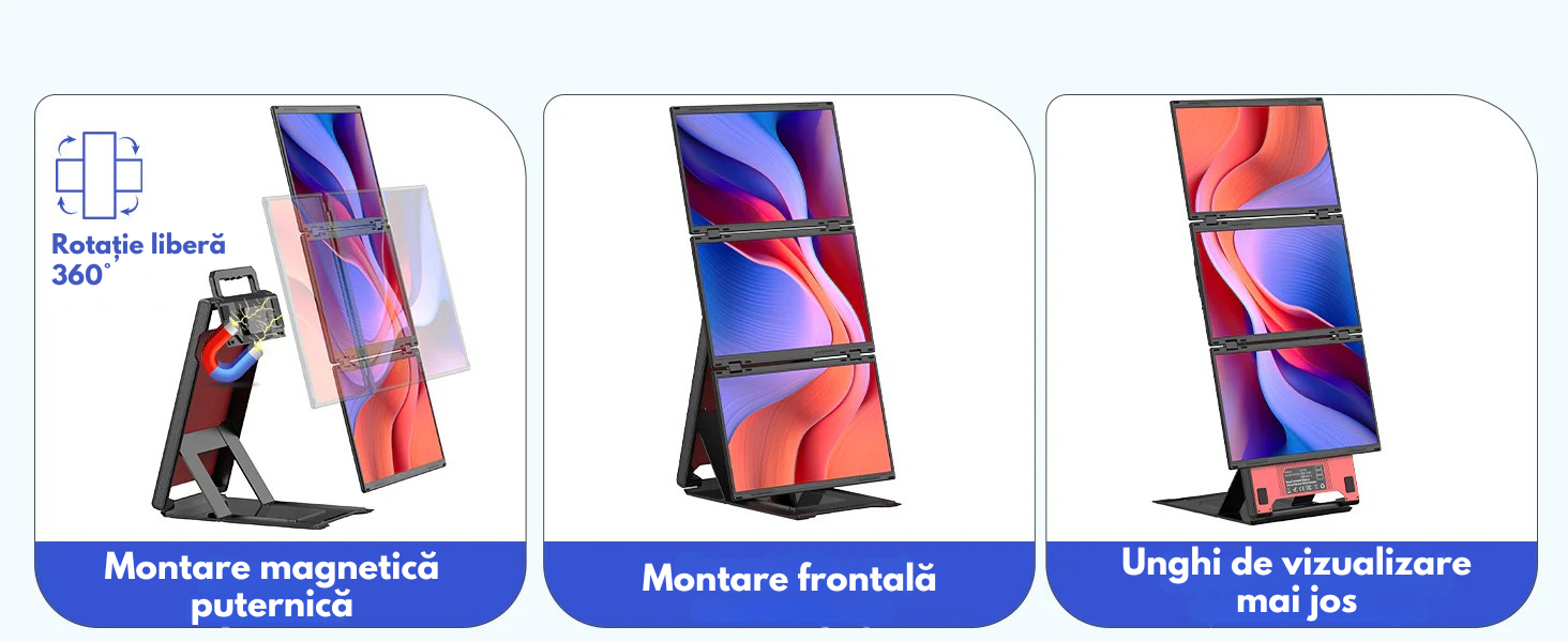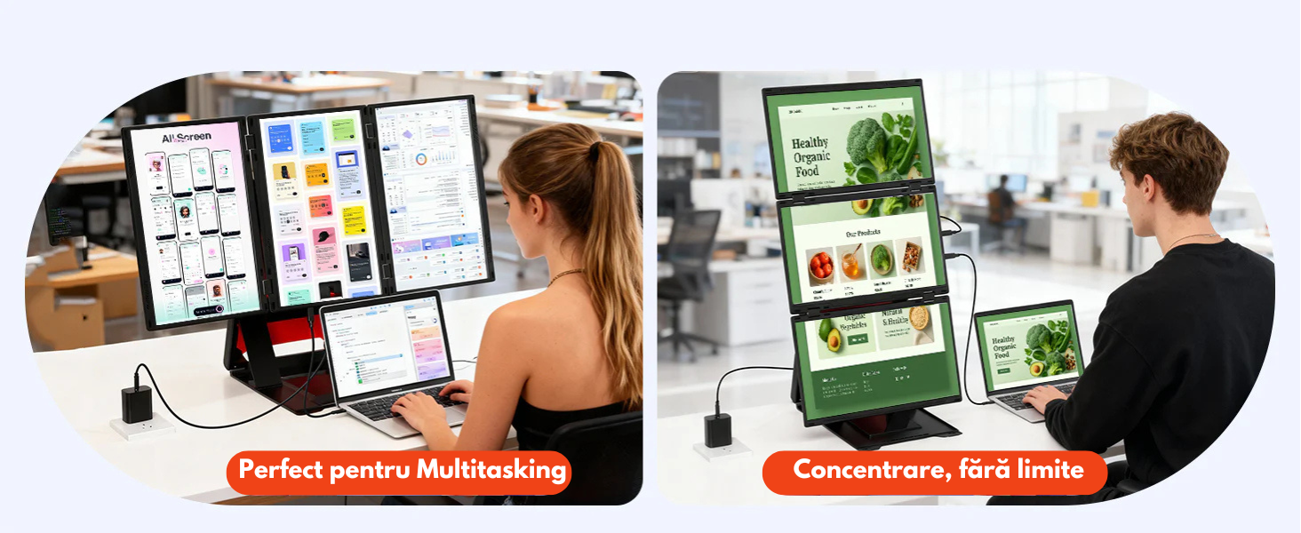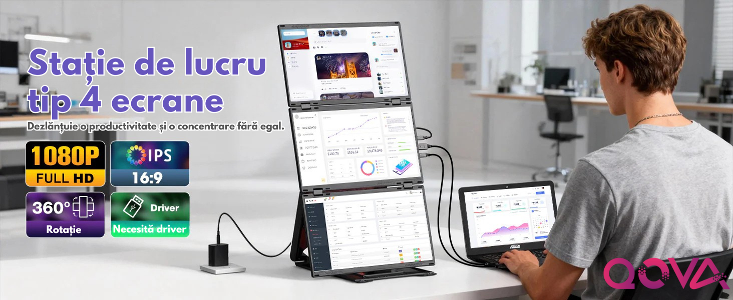 Transforma-ti laptopul intr-o statie de lucru profesionala cu pana la 4 ecrane si bucura-te de un nivel complet nou de productivitate. Acest extensor triplu de ecran portabil este solutia ideala pentru profesionisti, creatori de continut, programatori, analisti, designeri sau utilizatori care lucreaza intensiv in multitasking.