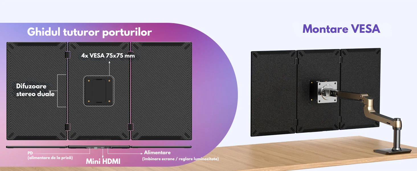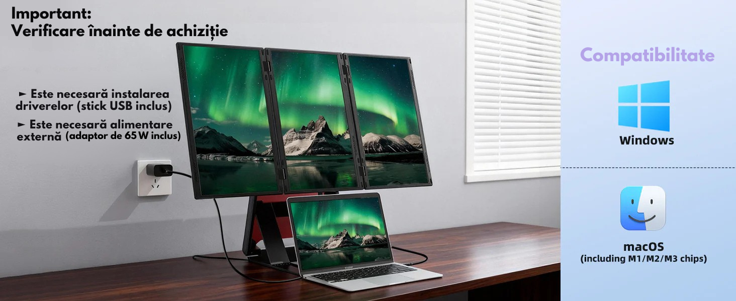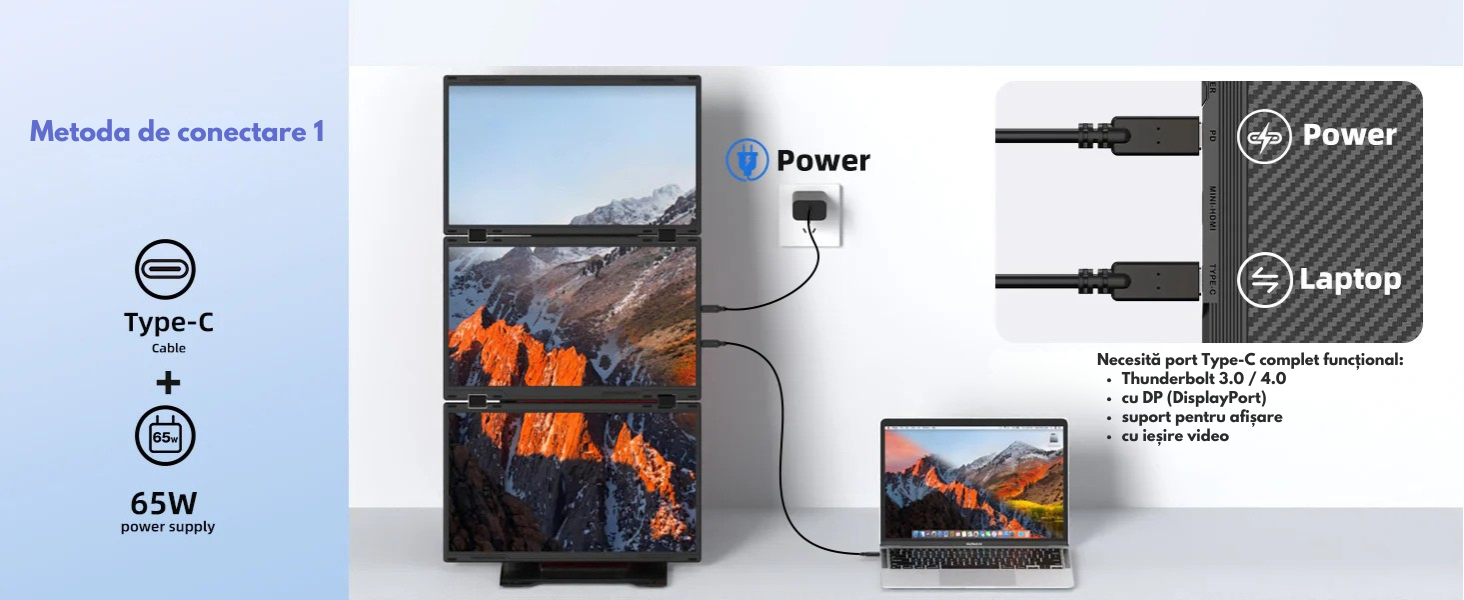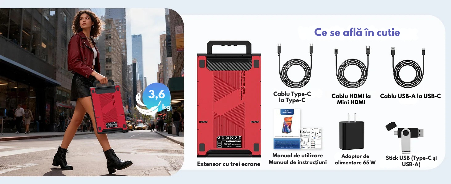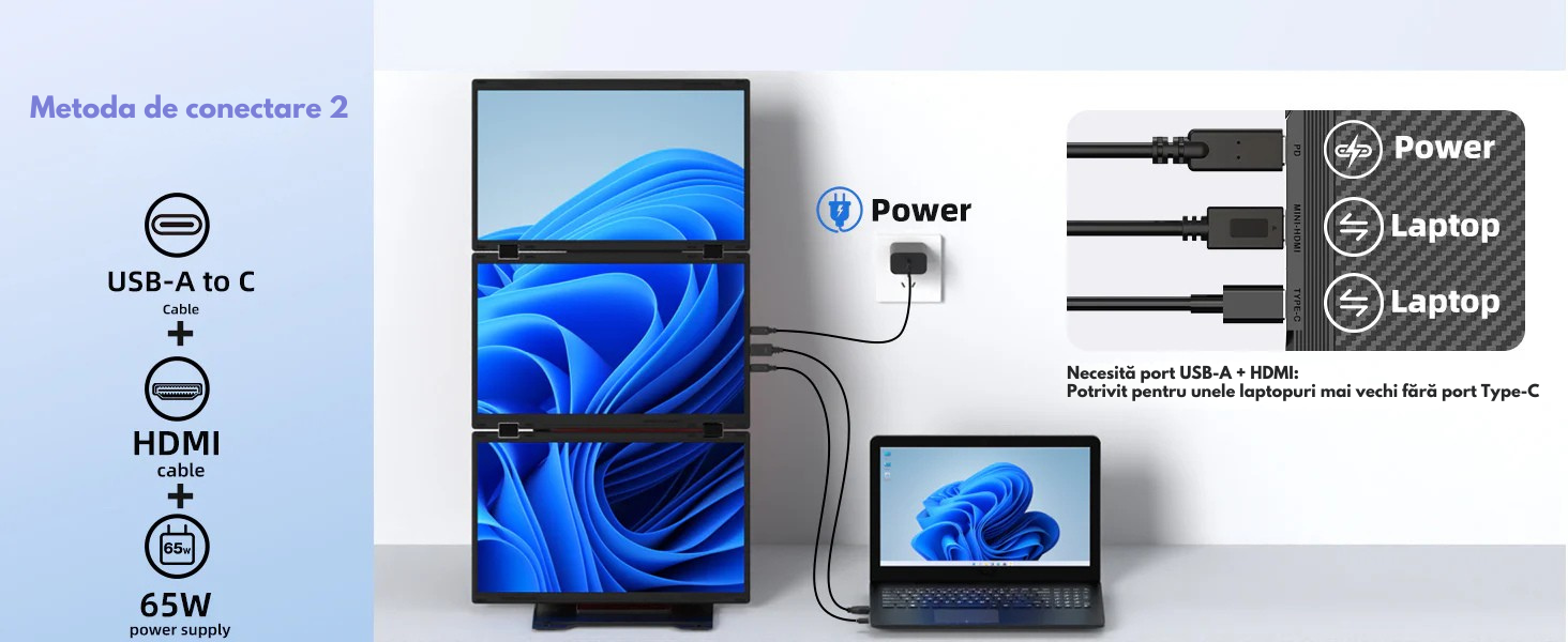 Transforma-ti laptopul intr-o statie de lucru profesionala cu pana la 4 ecrane si bucura-te de un nivel complet nou de productivitate. Acest extensor triplu de ecran portabil este solutia ideala pentru profesionisti, creatori de continut, programatori, analisti, designeri sau utilizatori care lucreaza intensiv in multitasking.