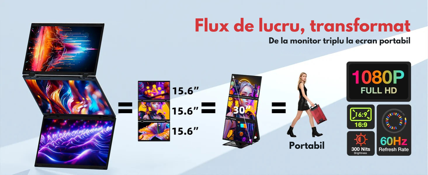 Cele 3 ecrane IPS de 15,6” Full HD (1920×1080) se pot folosi individual sau combinate intr-un afisaj urias de pana la 30”, oferindu-ti spatiu amplu pentru aplicatii, documente, grafice sau editare vizuala.