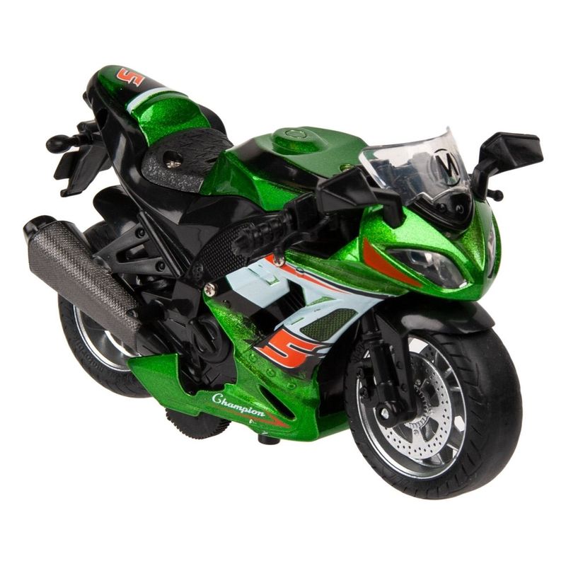 Motocicleta jucarie die cast, model 1:14, sunet si lumina, culoare verde, metal si plastic Motocicleta jucarie die cast, model 1:14, sunet si lumina, culoare verde, metal si plastic
