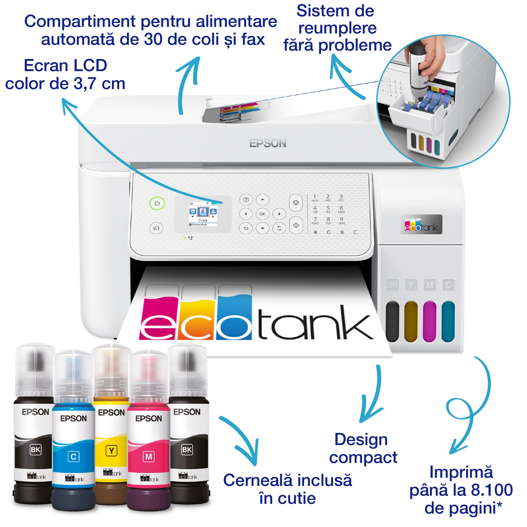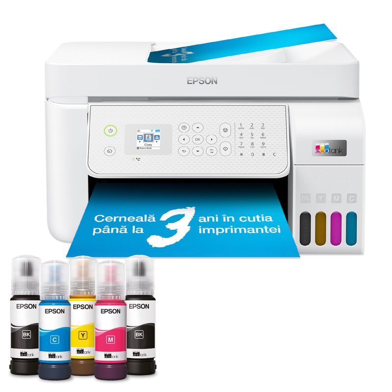 Economisiti pana la 90% din costurile cu cerneala* cu imprimantele Epson EcoTank fara cartuse. Furnizate cu recipiente de cerneala de mare capacitate, rezervoarele de cerneala integrate sunt usor de umplut, datorita recipientelor de cerneala special proiectate. Fara cartuse de schimb si cu caracteristici flexibile de conectivitate, aceasta este imprimanta perfecta pentru toti cei care au nevoie de imprimari de calitate superioara la un cost pe pagina incredibil de scazut.