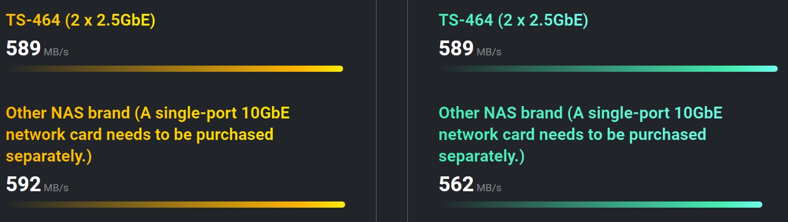 Cu o disponibilitate din ce in ce mai mare pe switch-uri, placi de baza si laptopuri, 2023 este anul 2,5GbE. NAS-ul TS-464 de 2,5GbE este la fel de rapid ca un NAS 10GbE cu un singur port. Prin setarea port trunking cu cele doua porturi 2,5GbE (2,5G/1G/100M) incorporate pentru a elibera potentialul retelei si a creste toleranta la erori, TS-464 ofera viteze de transfer de pana la 589 MB/s.