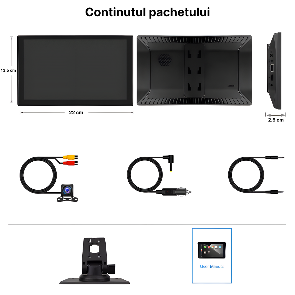 Navigatie auto multimedia MaGeCa®, Apple CarPlay/Android Auto Wireless, Display tactil 9 inch, Bluetooth, Mirror Link/Card SD/USB/AUX, Portabila, Universala, Camera marsarier, Negru
