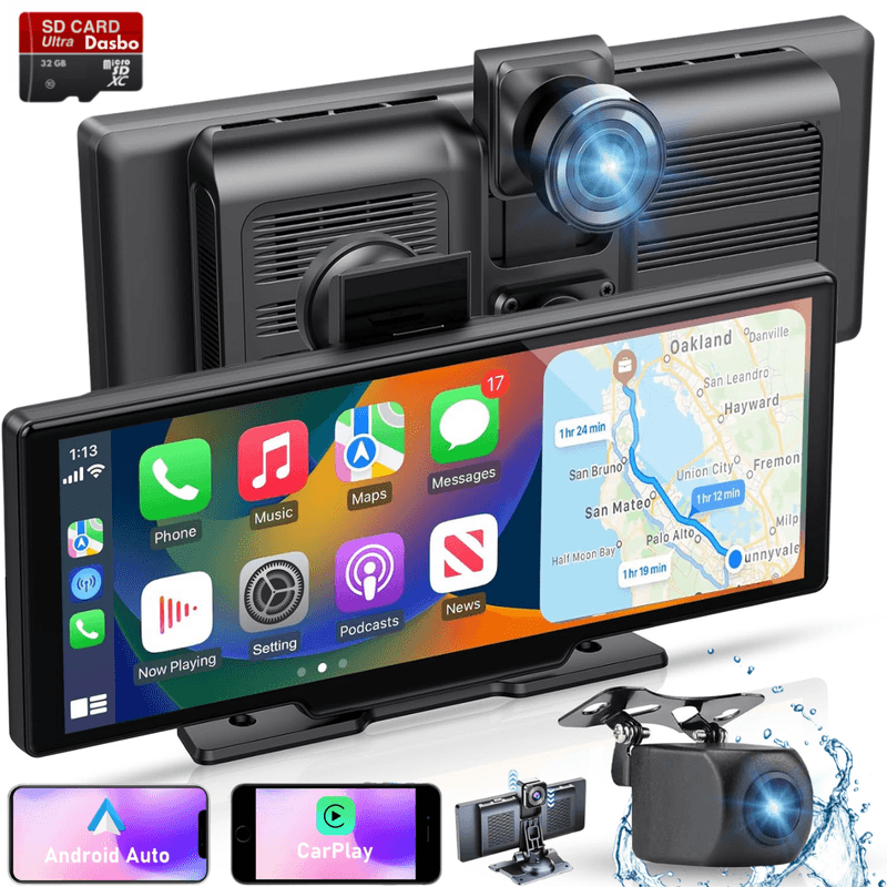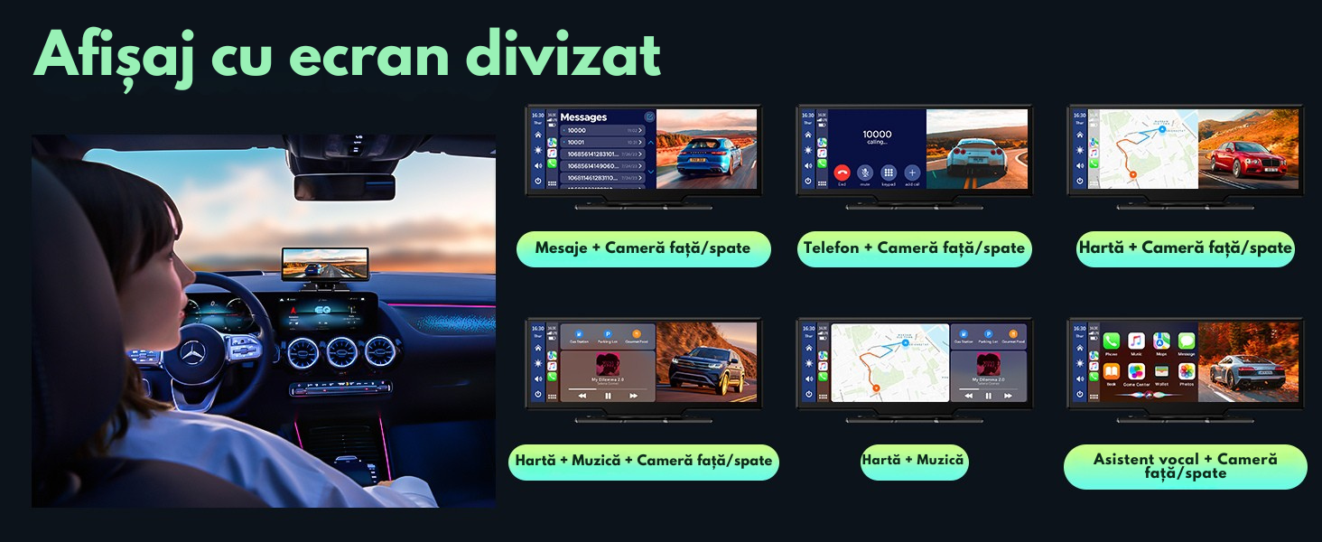 Navigatie Auto Multimedia Universarala Dasbo®, Display 10.26 inch, Camera inregistrare fata + spate inclusa, Ecran IPS HD full-touch, Apple Carplay si Android Auto Wireless, Bluetooth, FM, AUX, MirrorCast, Split-screen, GPS-integrat, Card Micro-SD 32 GB. Transforma orice masina intr-un vehicul inteligent cu noul sistem multimedia CarPlay & Android Auto!