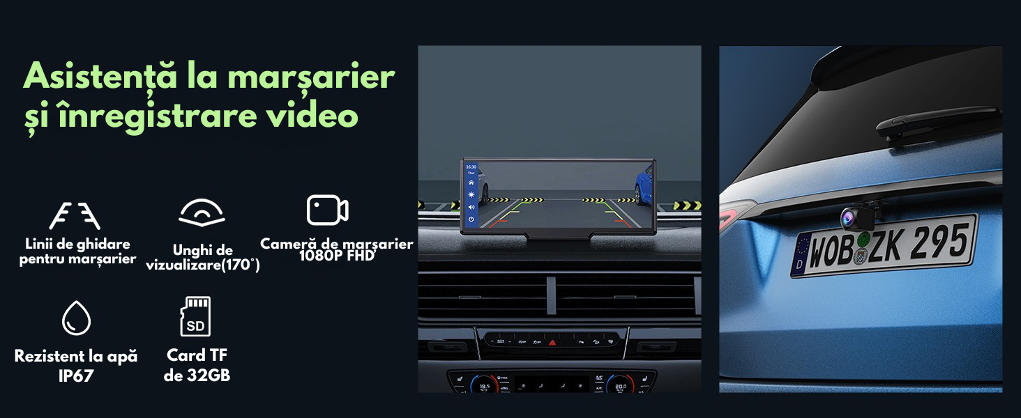 🚗 Asistenta la parcare cu linii de ghidaj si vedere clara in spate datorita camerei 1080P.