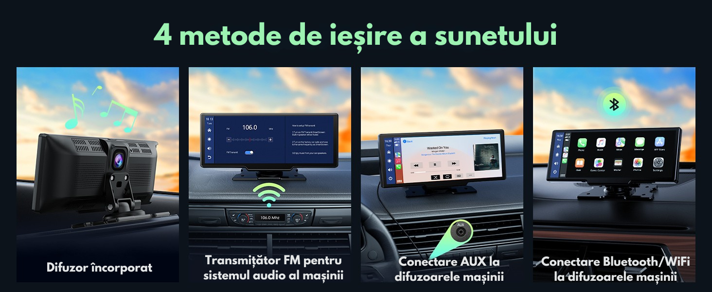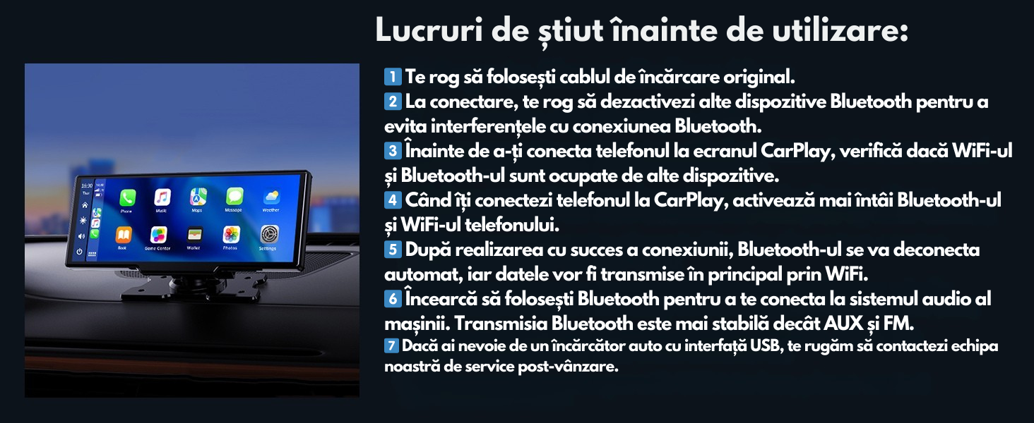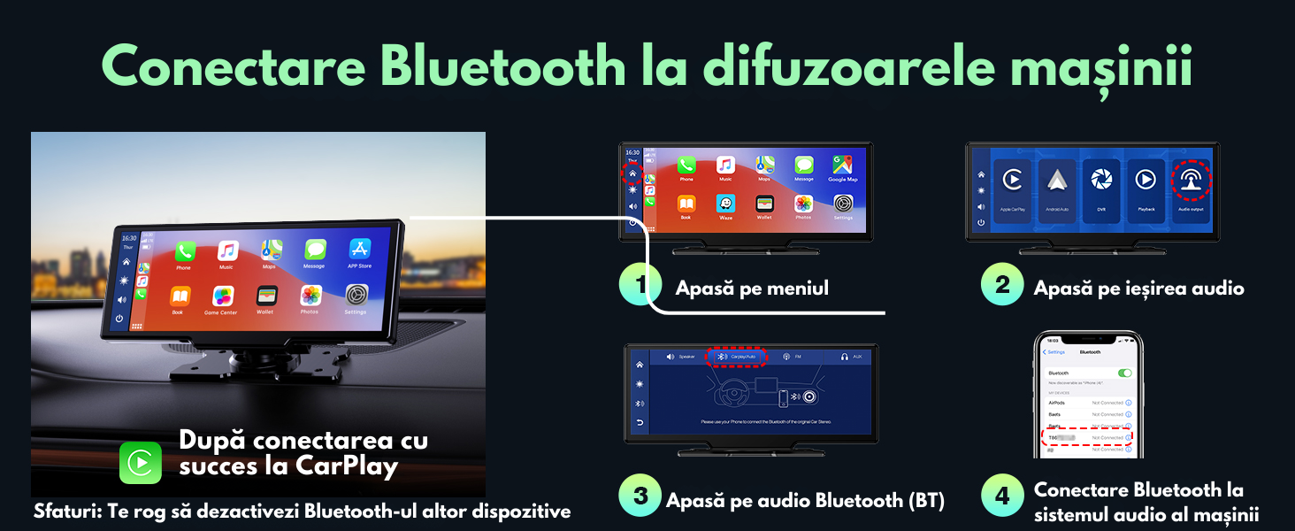 🚗 Sistem audio Bluetooth imbunatatit: Ecranul Apple CarPlay are o metoda imbunatatita de conexiune Bluetooth. Poti reda sunetul prin transmisie Bluetooth catre difuzoarele sistemului audio al masinii, obtinand astfel o experienta audio auto fara pierderi. In plus, sunt acceptate si transmisia audio FM wireless si iesirea audio AUX.
