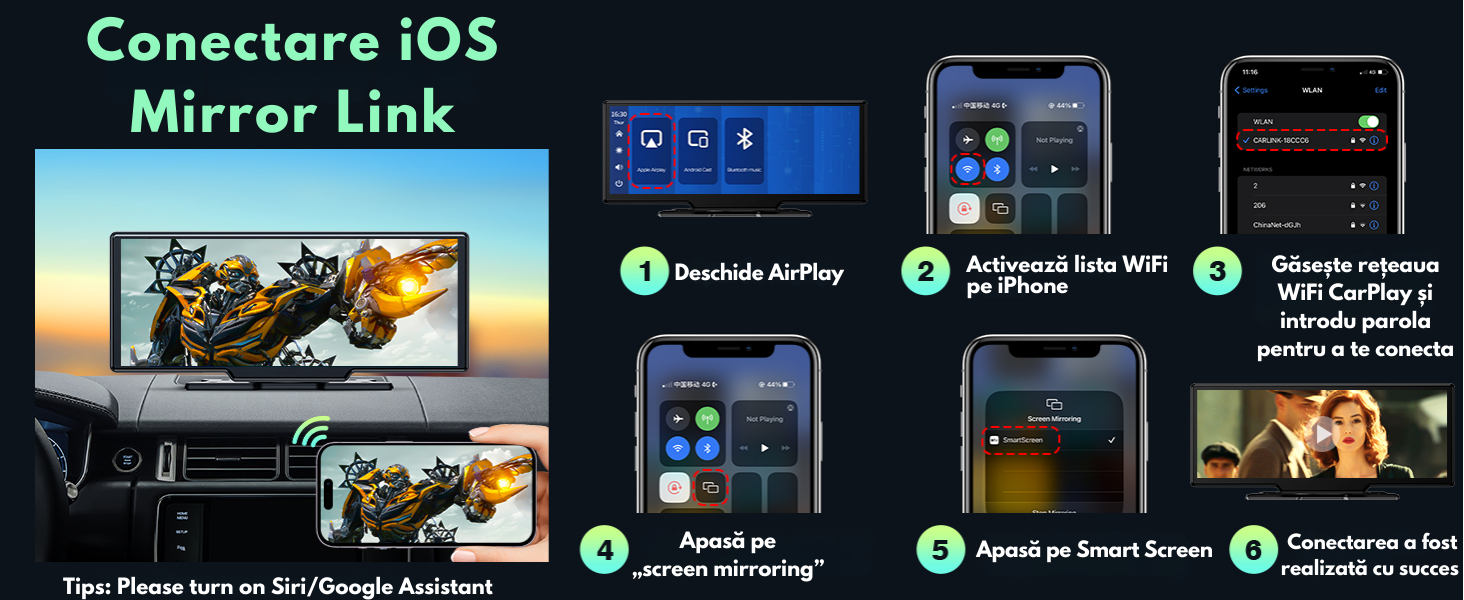 🗣️ Controleaza totul prin comenzi vocale cu Siri sau Google Assistant, pentru o experienta de condus sigura.