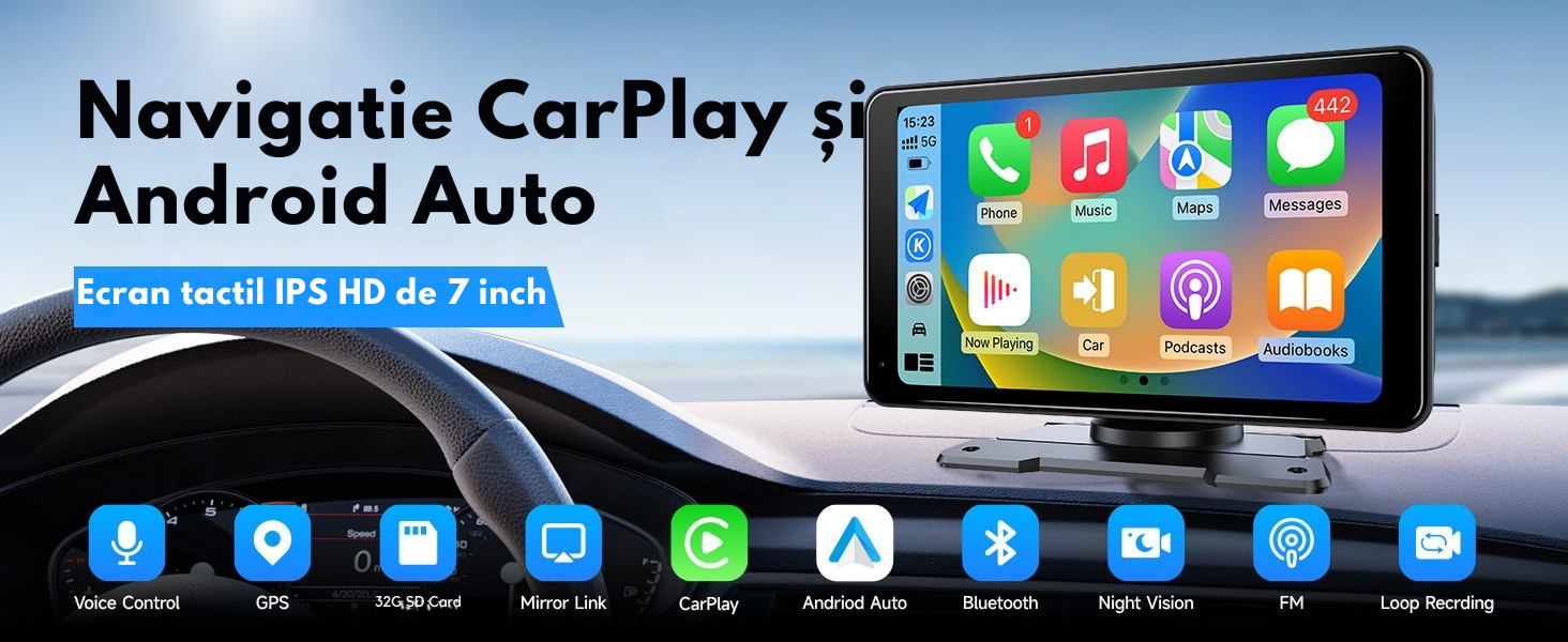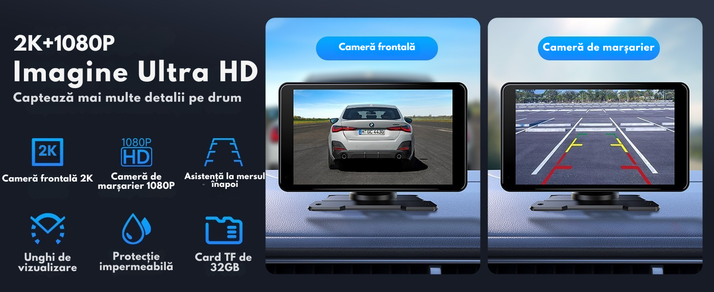 ✔️ Usor de instalat – Nu necesita interventii tehnice. ✔️ Siguranta & confort – Acces rapid la functii prin comanda vocala. ✔️ Conectivitate completa – Apple CarPlay, Android Auto, Bluetooth, FM, MirrorLink. ✔️ Imagini clare – Ecran IPS + camera frontala 2K + camera spate 1080P. ✔️ Inregistrare video continua – Ideal pentru monitorizare si siguranta.