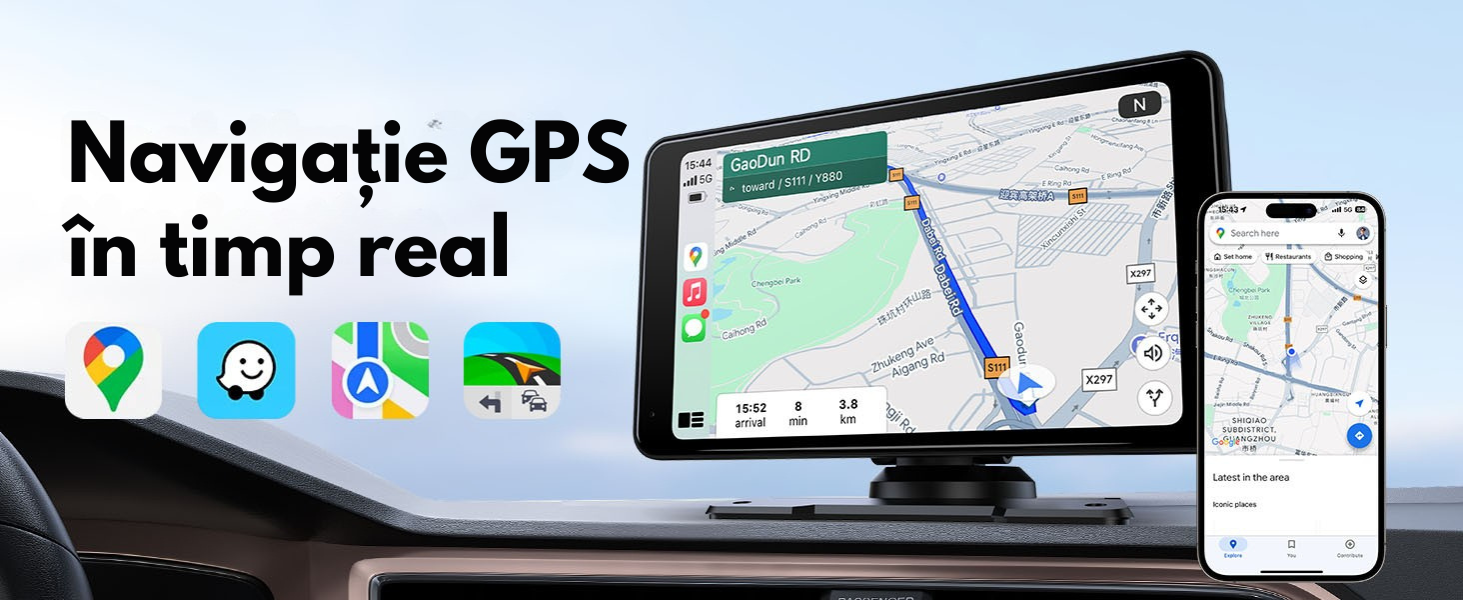 【Harti online si GPS in timp real】 – Navigatia GPS pentru masina poate proiecta perfect ecranul smartphone-ului pe ecranul masinii, oferind indicatii in timp real prin aplicatii populare precum Google Maps si Waze. Fie ca navighezi pe strazile orasului sau pleci intr-o calatorie lunga, vei primi recomandari de traseu precise si actualizari de trafic.